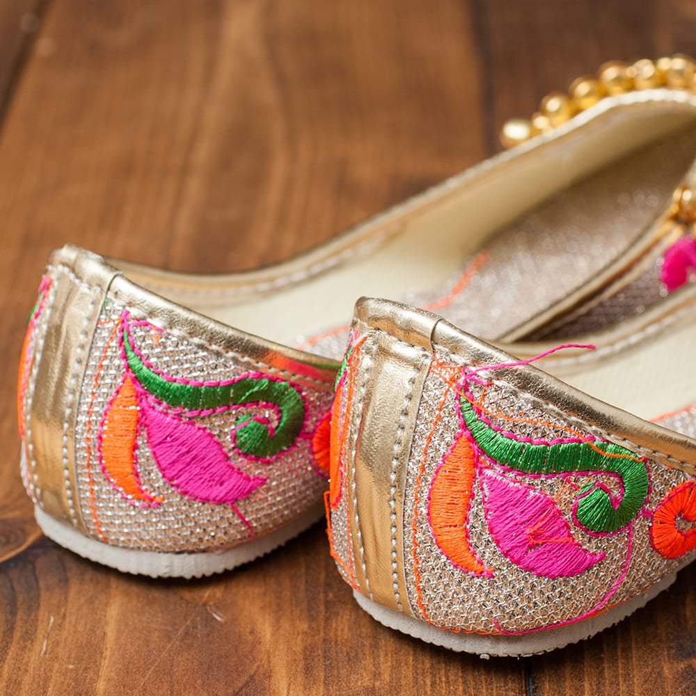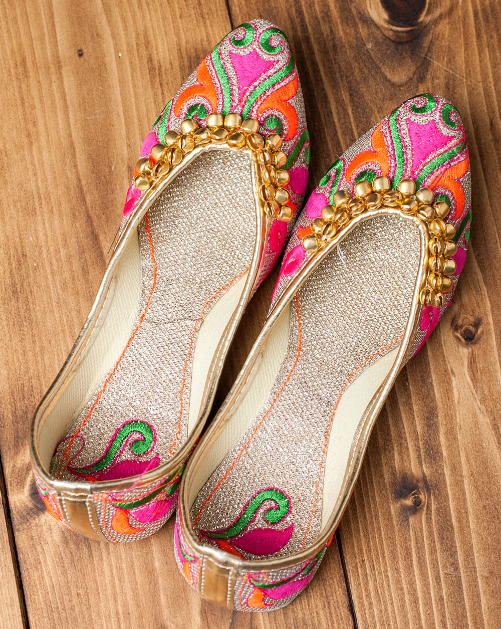 色とりどりのサリーが舞う国インドから華やかなフラットシューズがやって来ました。ビーズやスパンコールがキラキラと輝き、ところ狭しと刺繍が施されています。このシューズでパンジャビドレスやサリーを合わせたら、コーディネートは完璧だね!というインドスタイルです。どれも微妙にデザインが異なりますが、どれが良いか迷ってしまうくらいバランスの取れた配色にうっとりします。インドの女性って本当に華やかなデザインが好きなんだな?と改めて実感する一品です。エスニックファッションだけでなく、シンプルにデニムやTシャツに合わせてもかっこよく決まりますよ!