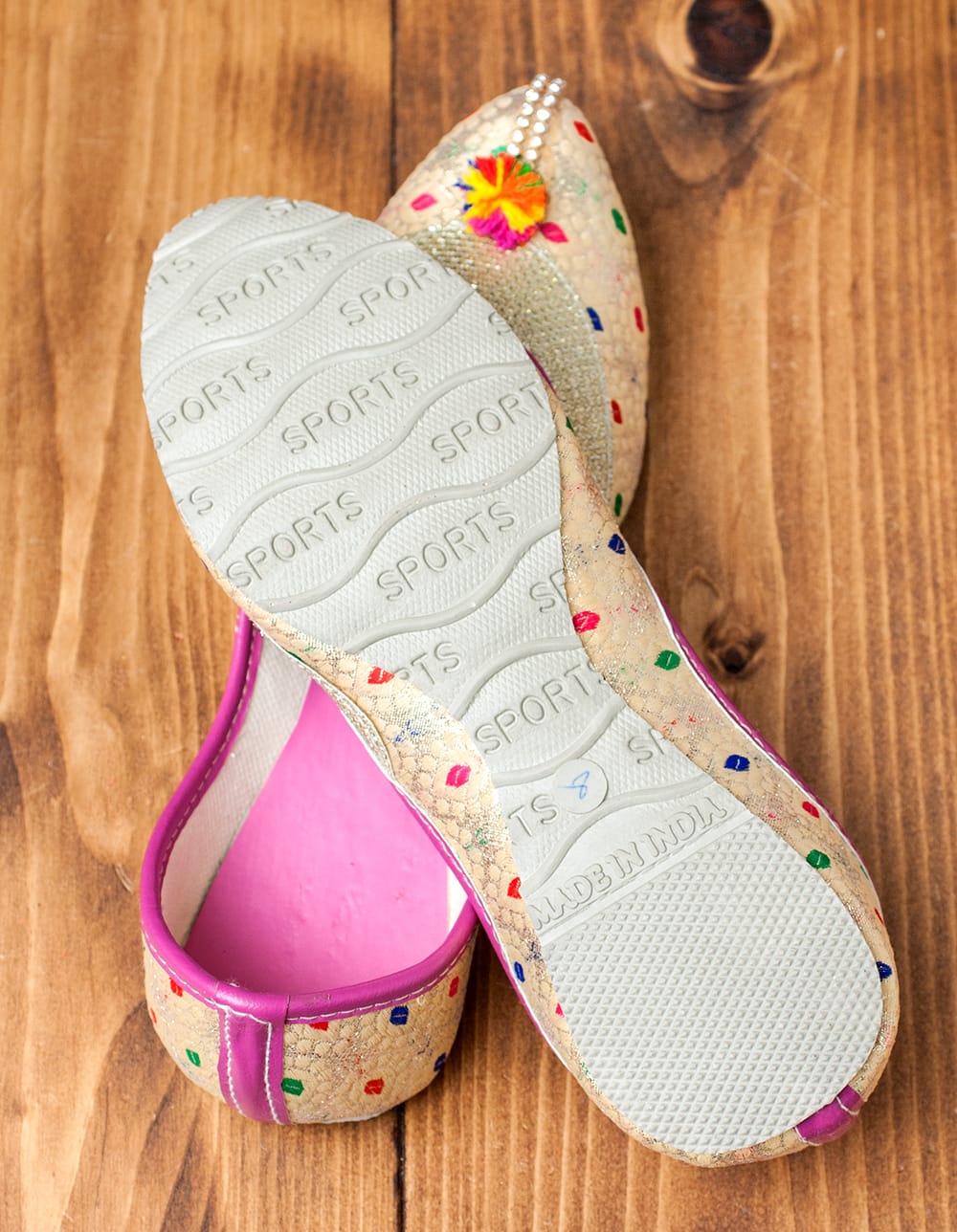 可愛いです!キラキラです!しかもパッと見た感じの大らかな造りに反して予想外に履きやすいです!手に取ったその時から小さなキラキラがぽろりと取れまして、歩いた後には時折キラリと落ちたりしてますが、えっとそれはどこから取れたんだろう?と気にならないほどキラキラです!足の形が特殊なのか、足に合った靴になかなか出会えない靴ジプシーの私…、履いた直後は踵が若干浮いて「大きいかも?」と感じましたが(通常23・5cm及び24cmの甲高でサイズ10を購入しました)なんと、歩いているうちに意外にも足に馴染んでくれました!すごい!びっくり!固すぎることはないものの底は薄いので、長時間歩くには疲れるかもしれませんが、実はざっくりなだけじゃない、インドクオリティは大らかで人に優しい。と感じるほど、履いていてウキウキ、楽しい気分になります。可愛くて、ウキウキで、そのうえこの価格。嬉しいー!ティラキタさん、ありがとうございました!