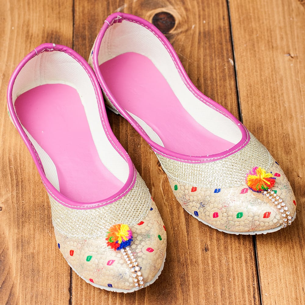 色とりどりのサリーが舞う国インドから華やかなフラットシューズがやって来ました。ビーズやスパンコールがキラキラと輝き、ところ狭しと刺繍が施されています。このシューズでパンジャビドレスやサリーを合わせたら、コーディネートは完璧だね!というインドスタイルです。どれも微妙にデザインが異なりますが、どれが良いか迷ってしまうくらいバランスの取れた配色にうっとりします。インドの女性って本当に華やかなデザインが好きなんだな?と改めて実感する一品です。エスニックファッションだけでなく、シンプルにデニムやTシャツに合わせてもかっこよく決まりますよ!