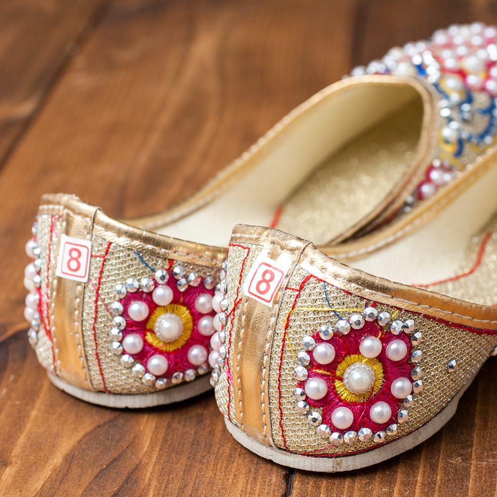 可愛いです!キラキラです!しかもパッと見た感じの大らかな造りに反して予想外に履きやすいです!手に取ったその時から小さなキラキラがぽろりと取れまして、歩いた後には時折キラリと落ちたりしてますが、えっとそれはどこから取れたんだろう?と気にならないほどキラキラです!足の形が特殊なのか、足に合った靴になかなか出会えない靴ジプシーの私…、履いた直後は踵が若干浮いて「大きいかも?」と感じましたが(通常23・5cm及び24cmの甲高でサイズ10を購入しました)なんと、歩いているうちに意外にも足に馴染んでくれました!すごい!びっくり!固すぎることはないものの底は薄いので、長時間歩くには疲れるかもしれませんが、実はざっくりなだけじゃない、インドクオリティは大らかで人に優しい。と感じるほど、履いていてウキウキ、楽しい気分になります。可愛くて、ウキウキで、そのうえこの価格。嬉しいー!ティラキタさん、ありがとうございました!