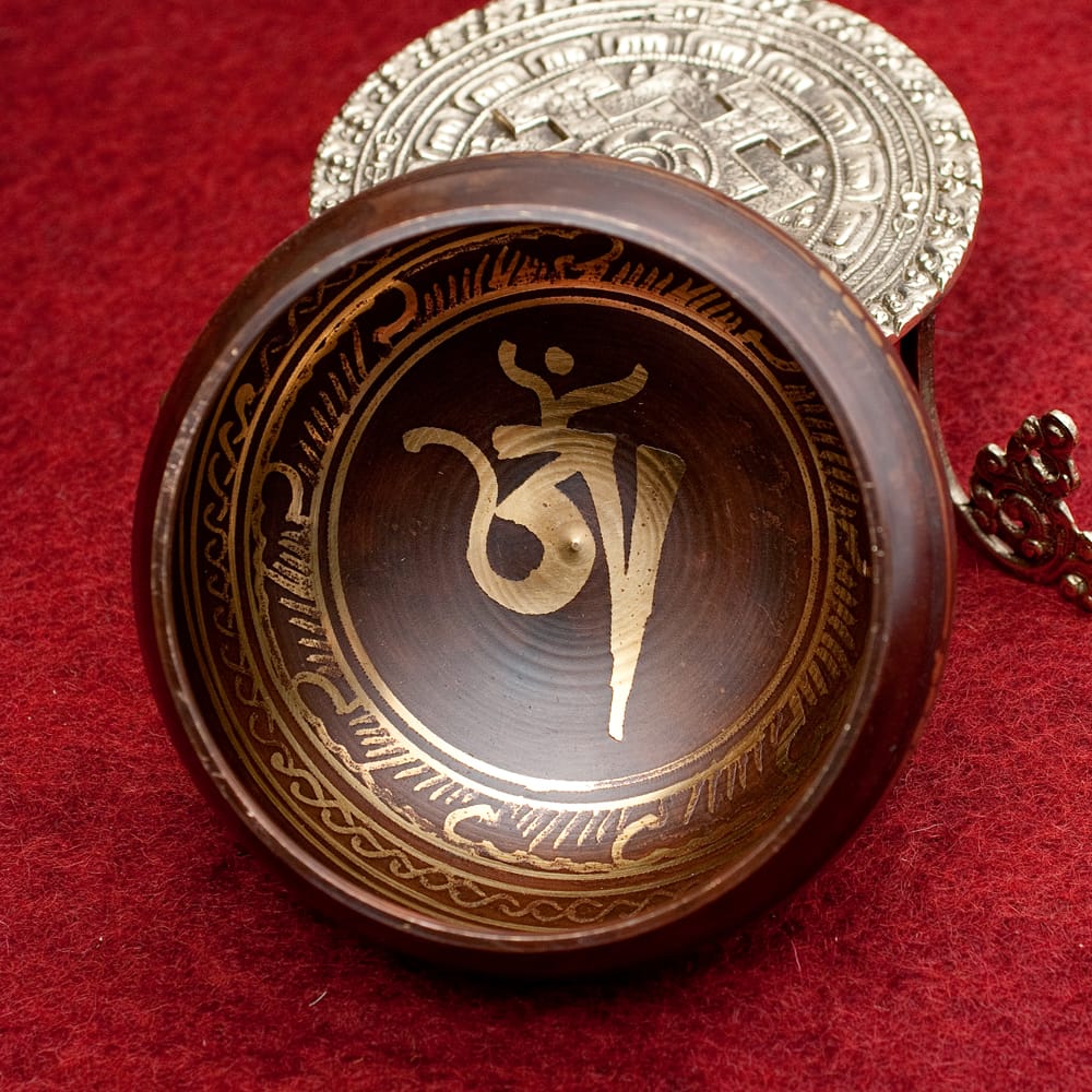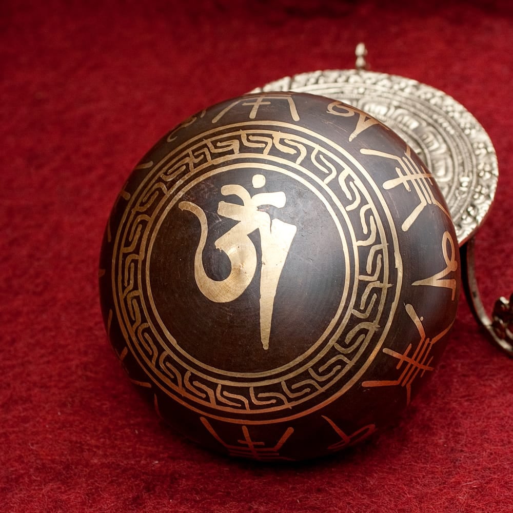 職人によって施された美しい金色の装飾は、触れた時のかすかな手触りも良いです。マントラや、ヴィシュヴァ・ヴァジュラ、アグニ、シャンカなどの吉兆柄に加え、ブッダやオーン、オンマニペメフム、ロータスなどが美しく彫られています。全ての柄をご覧いただけるよう、底面を含め写真に収めておりますので、是非御覧くださいませ。音色だけではなく、視覚的にも楽しく癒してくれる一品です。