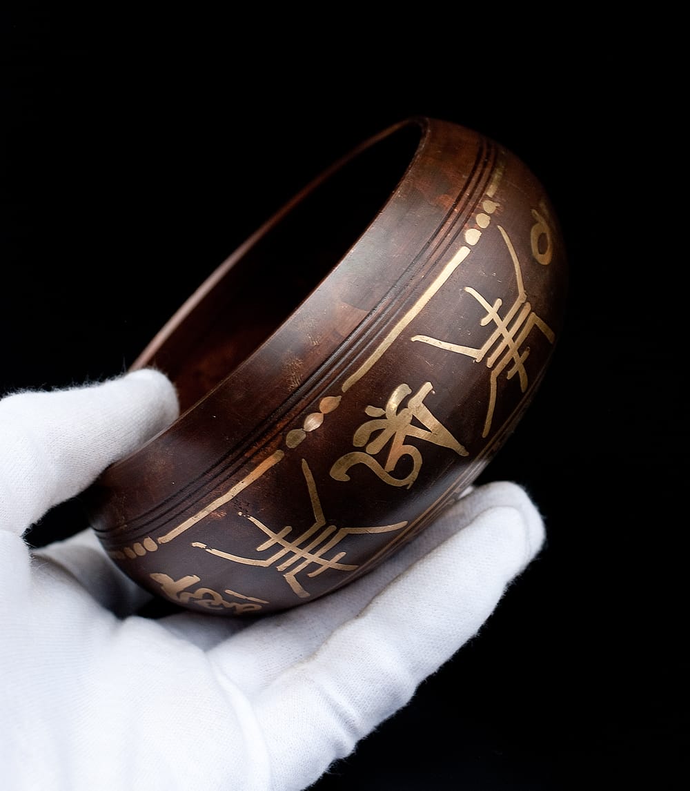 縁の部分も丁寧に加工されていて、回す時にも鳴らしやすい、チベタンシンギングボウル。落ち着いた焦げ茶色に加え、上品な金色の装飾も美しく、このシンギングボウルは楽器としての性能と、見た目の美しさを兼ね備えております。