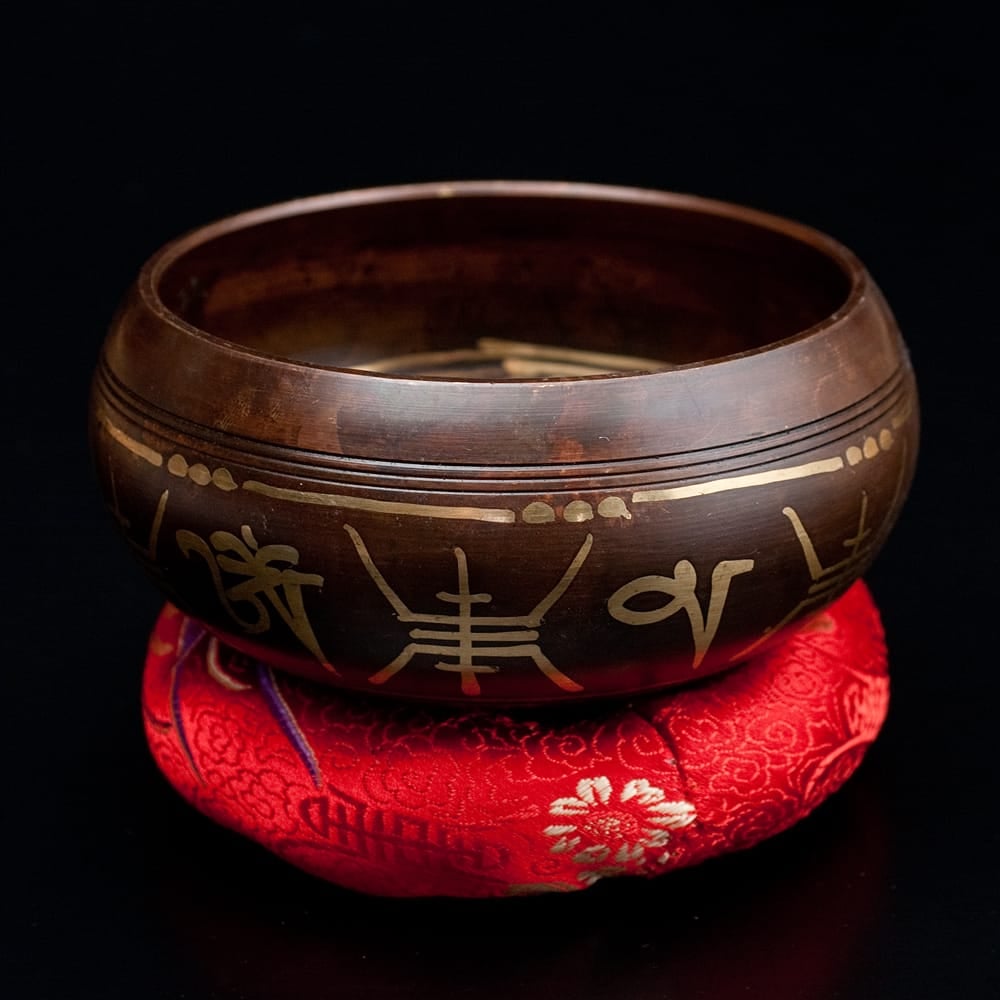 趣のある焦げ茶に金色の美しい装飾。鳴らしやすさが魅力のチベタンシンギングボウルです。(台座は付属いたしません)