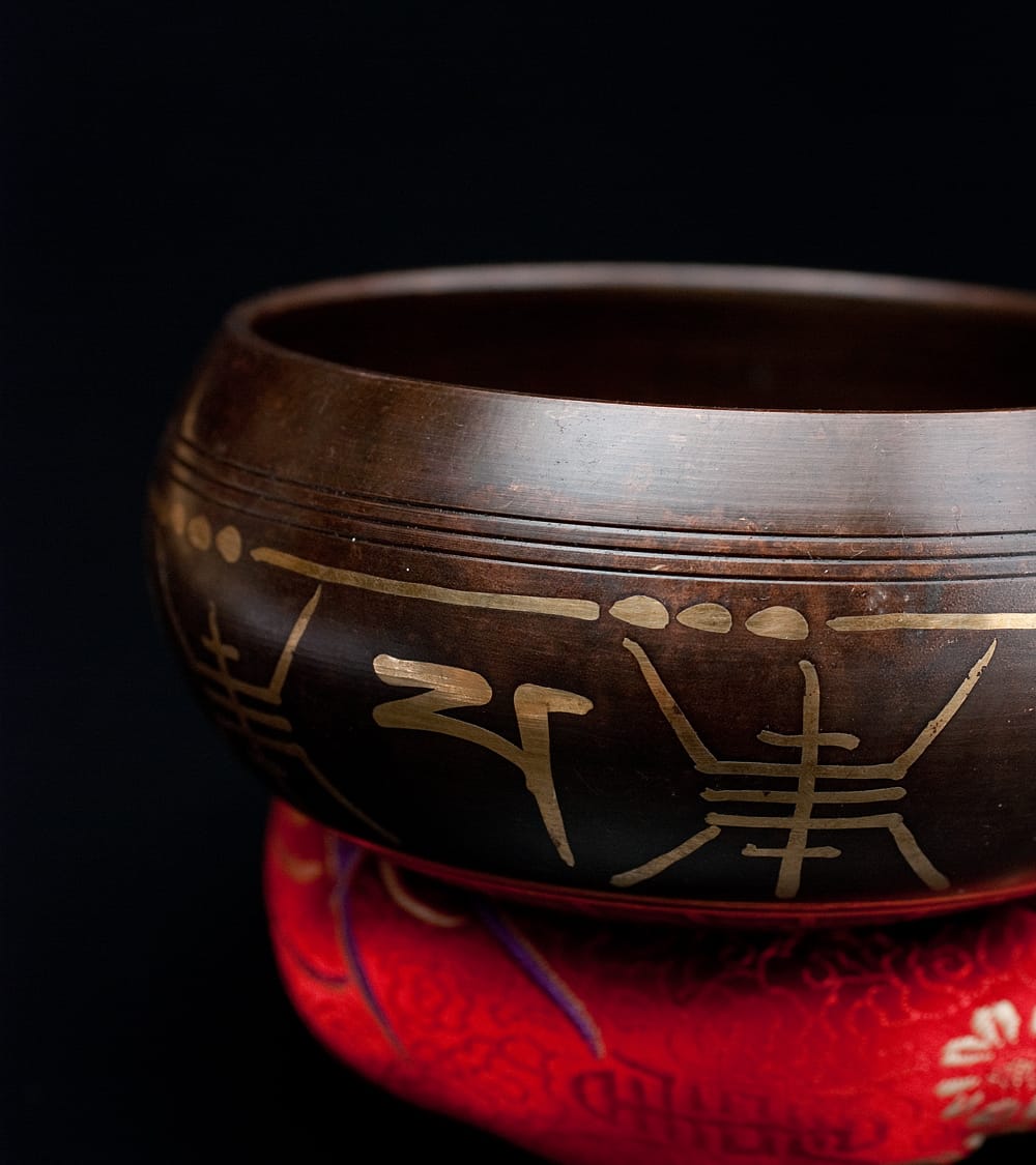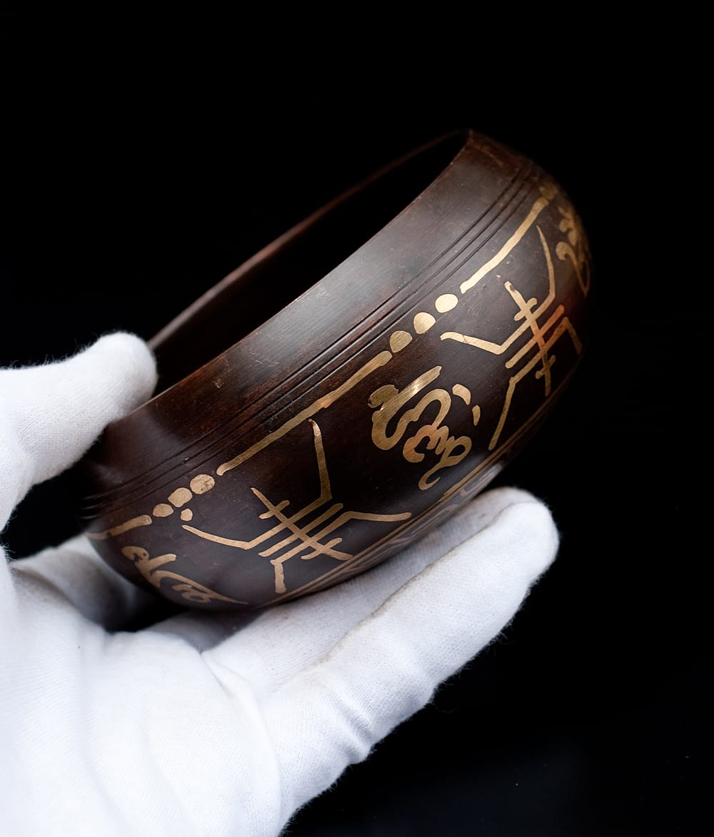 趣のある焦げ茶に金色の美しい装飾。鳴らしやすさが魅力のチベタンシンギングボウルです。(台座は付属いたしません)