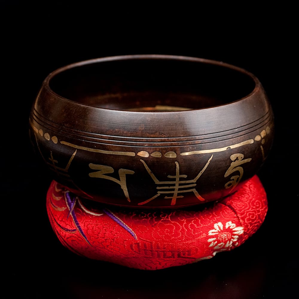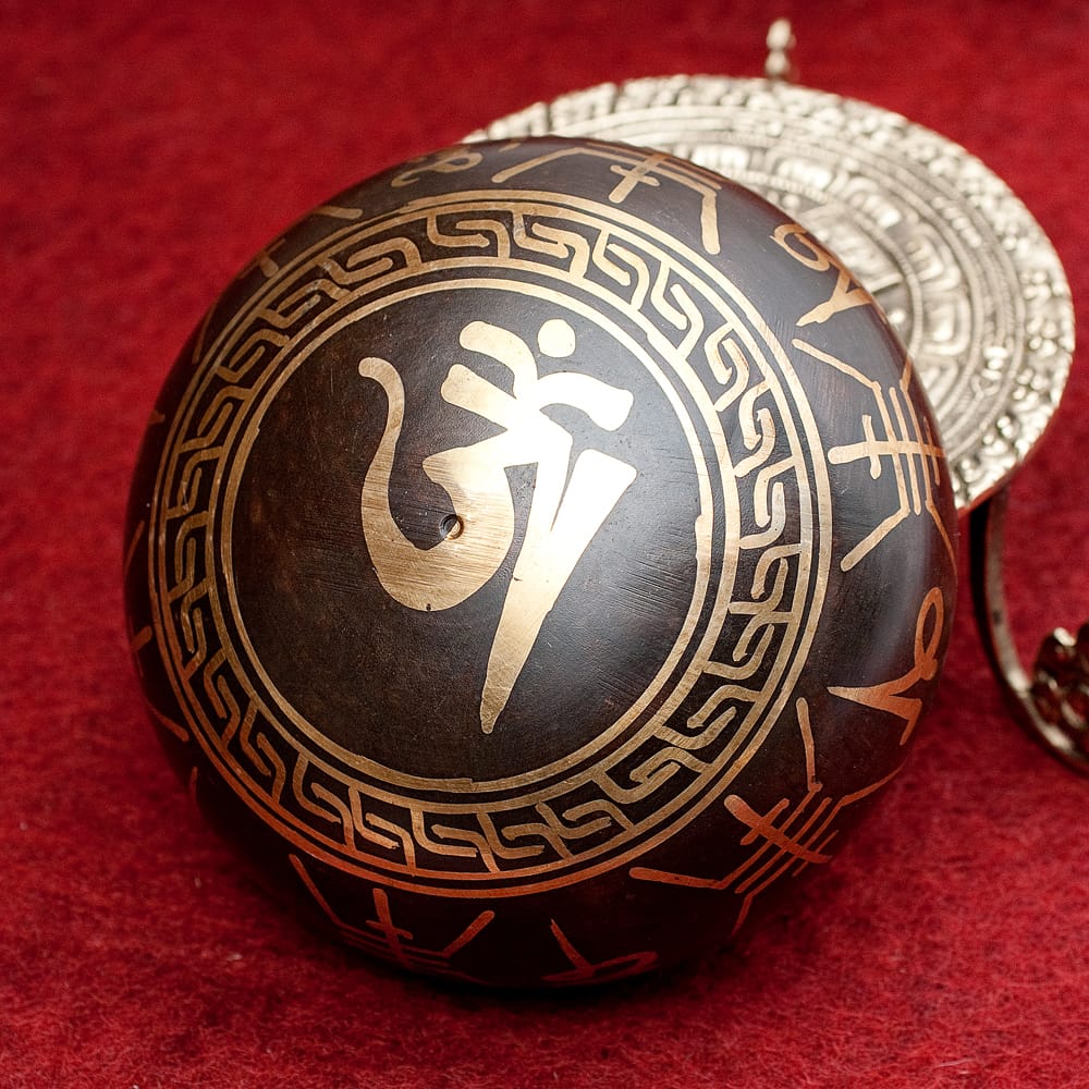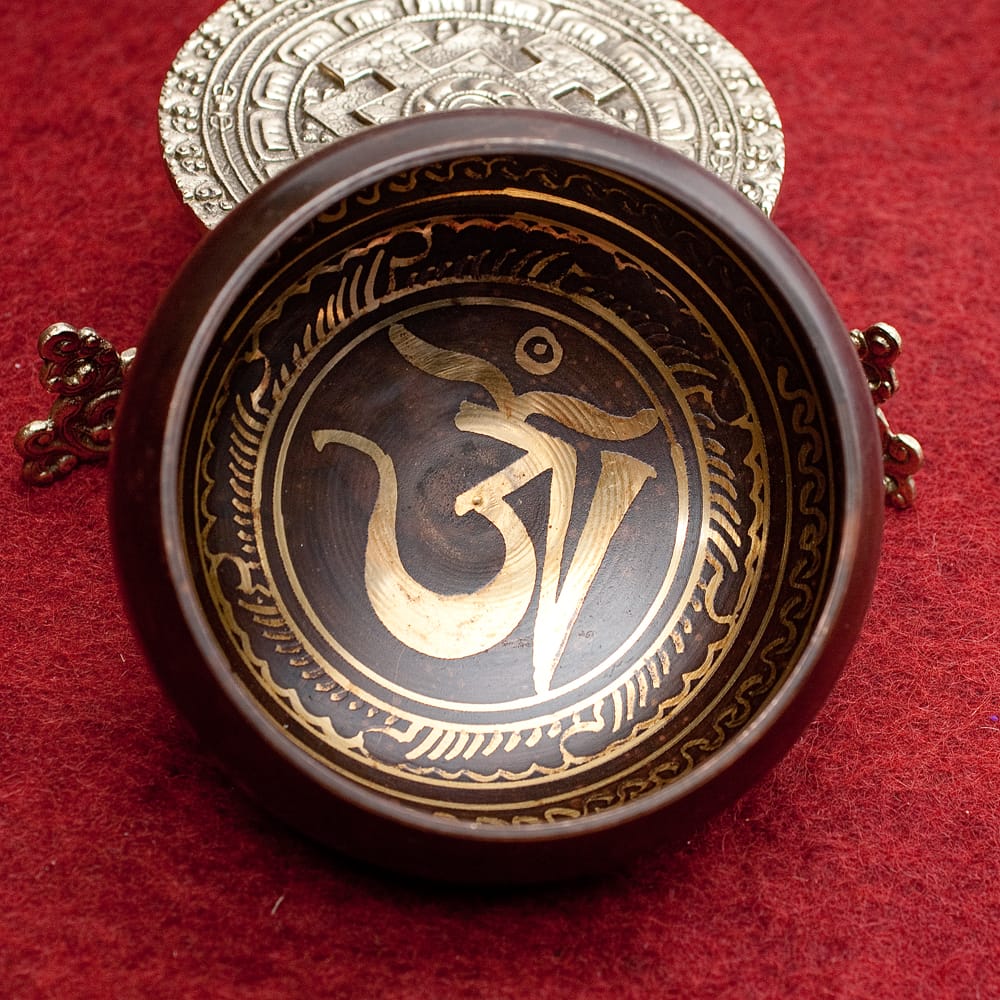 職人によって施された美しい金色の装飾は、触れた時のかすかな手触りも良いです。マントラや、ヴィシュヴァ・ヴァジュラ、アグニ、シャンカなどの吉兆柄に加え、ブッダやオーン、オンマニペメフム、ロータスなどが美しく彫られています。全ての柄をご覧いただけるよう、底面を含め写真に収めておりますので、是非御覧くださいませ。音色だけではなく、視覚的にも楽しく癒してくれる一品です。■シンギングボウルの鳴らし方について■