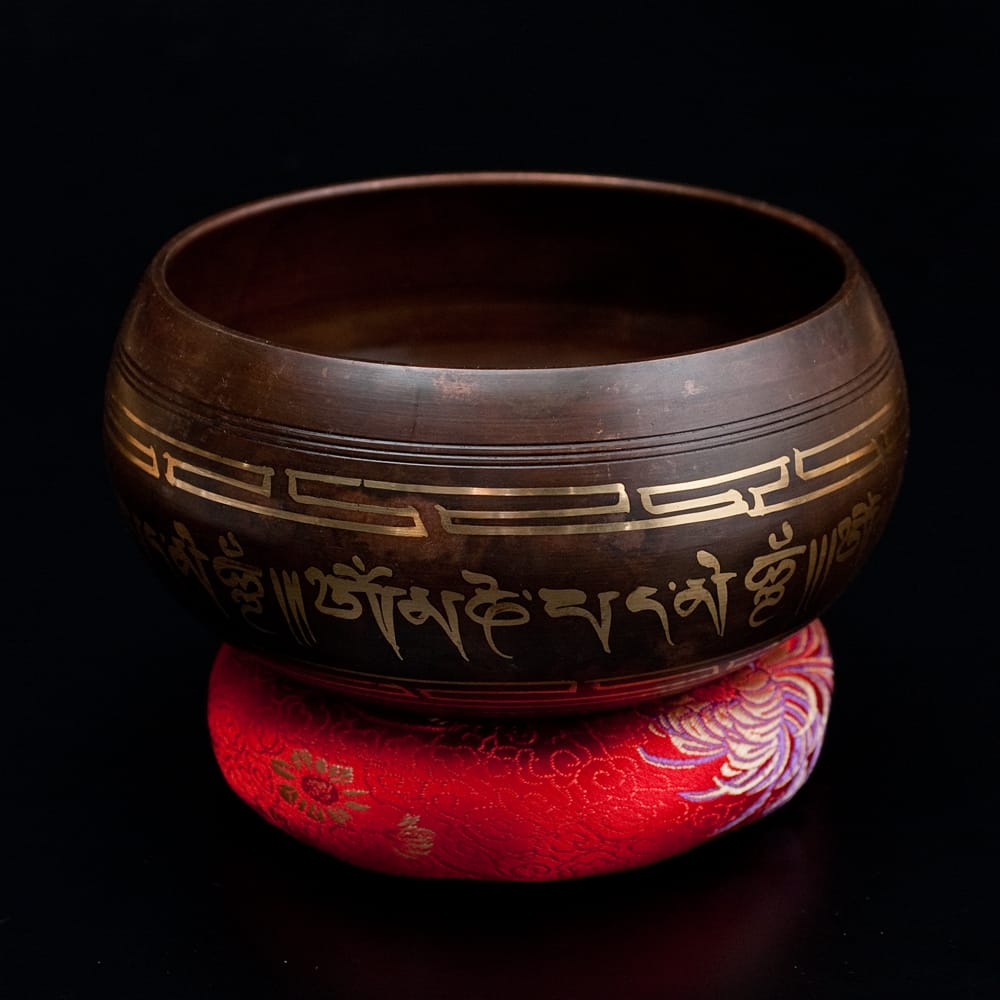 趣のある焦げ茶に金色の美しい装飾。鳴らしやすさが魅力のチベタンシンギングボウルです。(台座は付属いたしません)