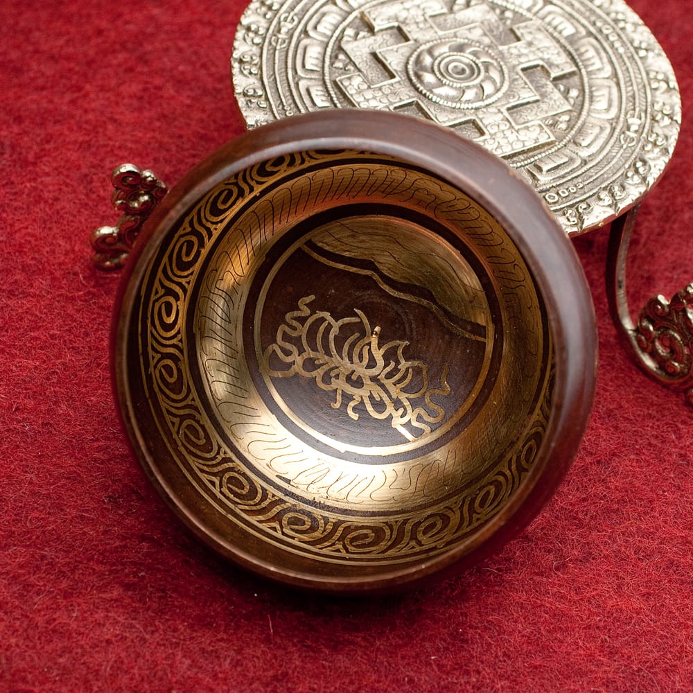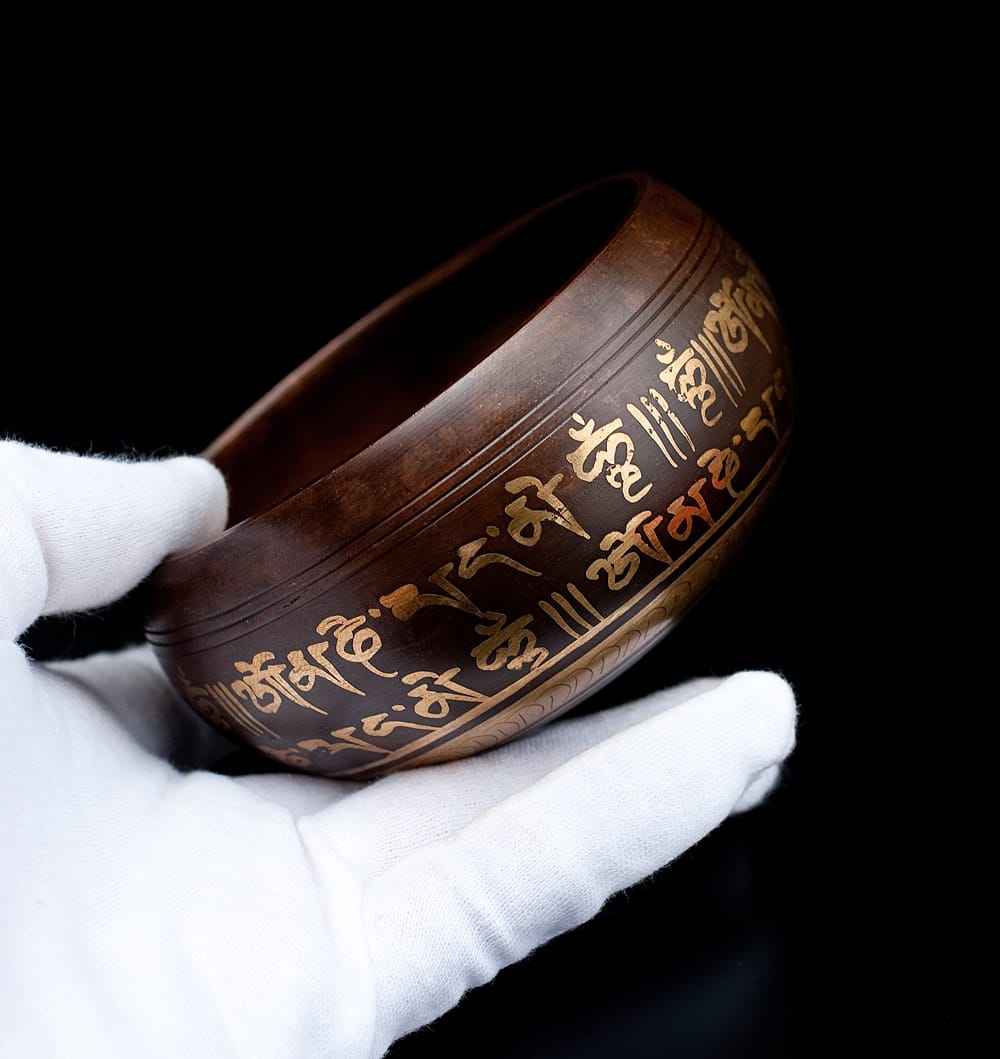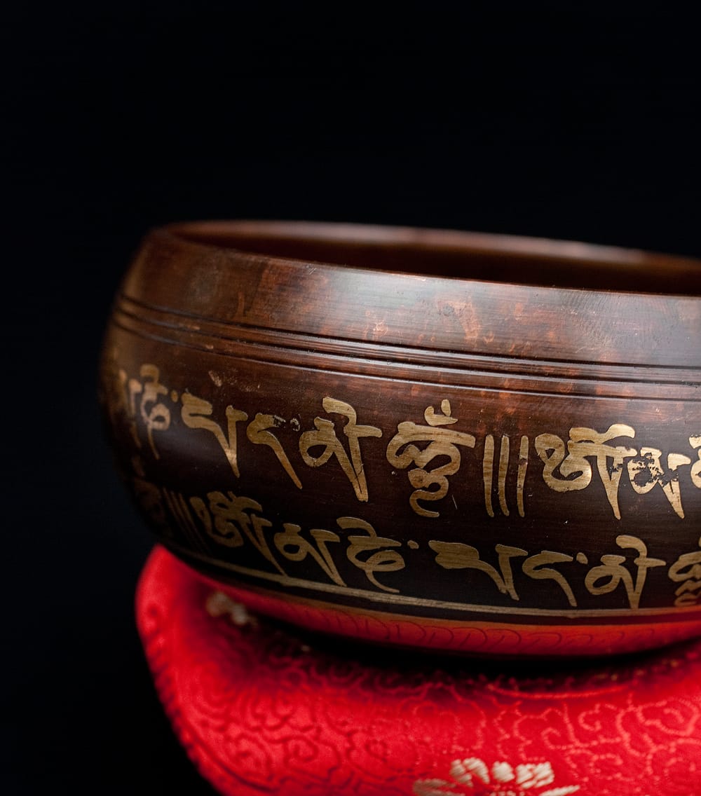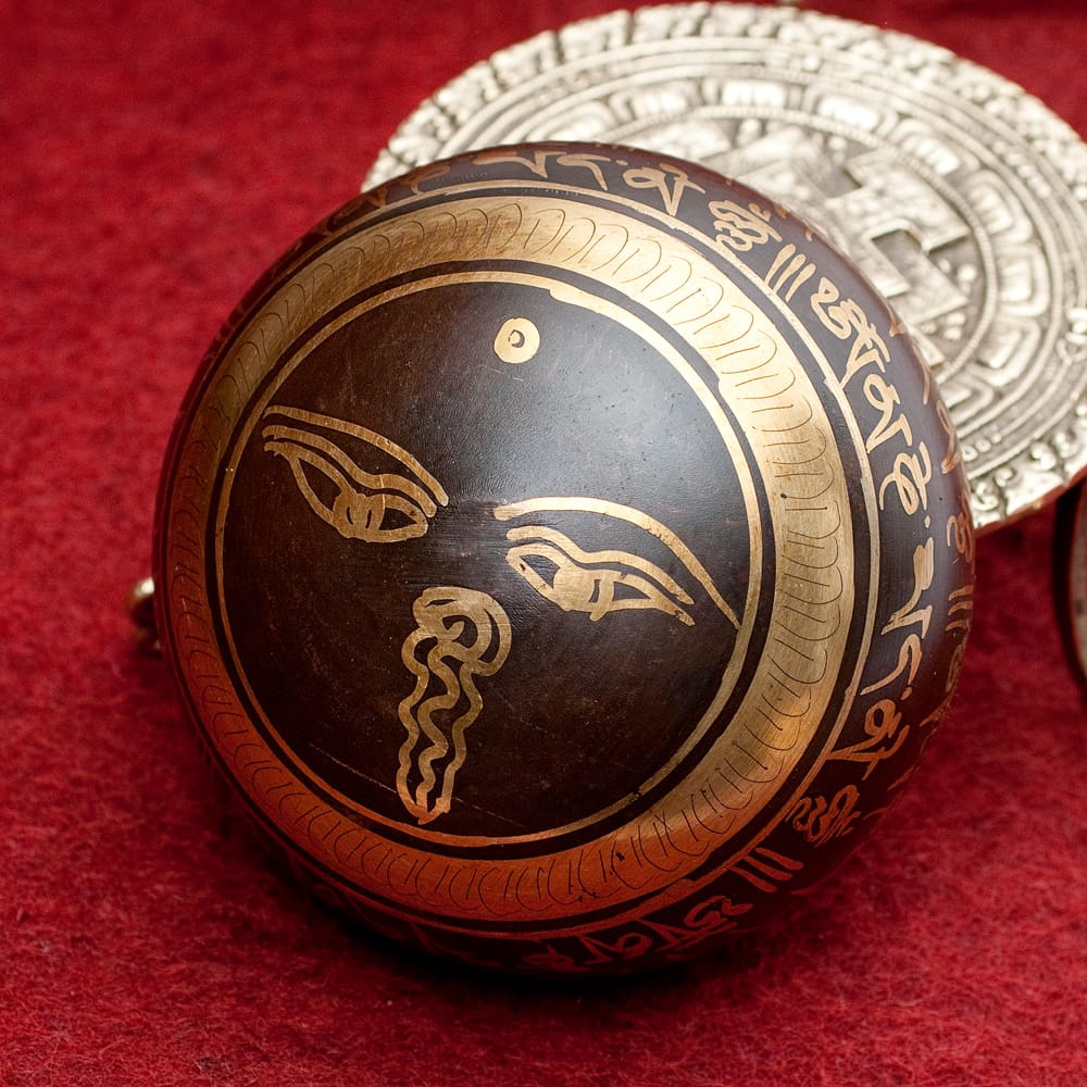職人によって施された美しい金色の装飾は、触れた時のかすかな手触りも良いです。マントラや、ヴィシュヴァ・ヴァジュラ、アグニ、シャンカなどの吉兆柄に加え、ブッダやオーン、オンマニペメフム、ロータスなどが美しく彫られています。全ての柄をご覧いただけるよう、底面を含め写真に収めておりますので、是非御覧くださいませ。音色だけではなく、視覚的にも楽しく癒してくれる一品です。■シンギングボウルの鳴らし方について■