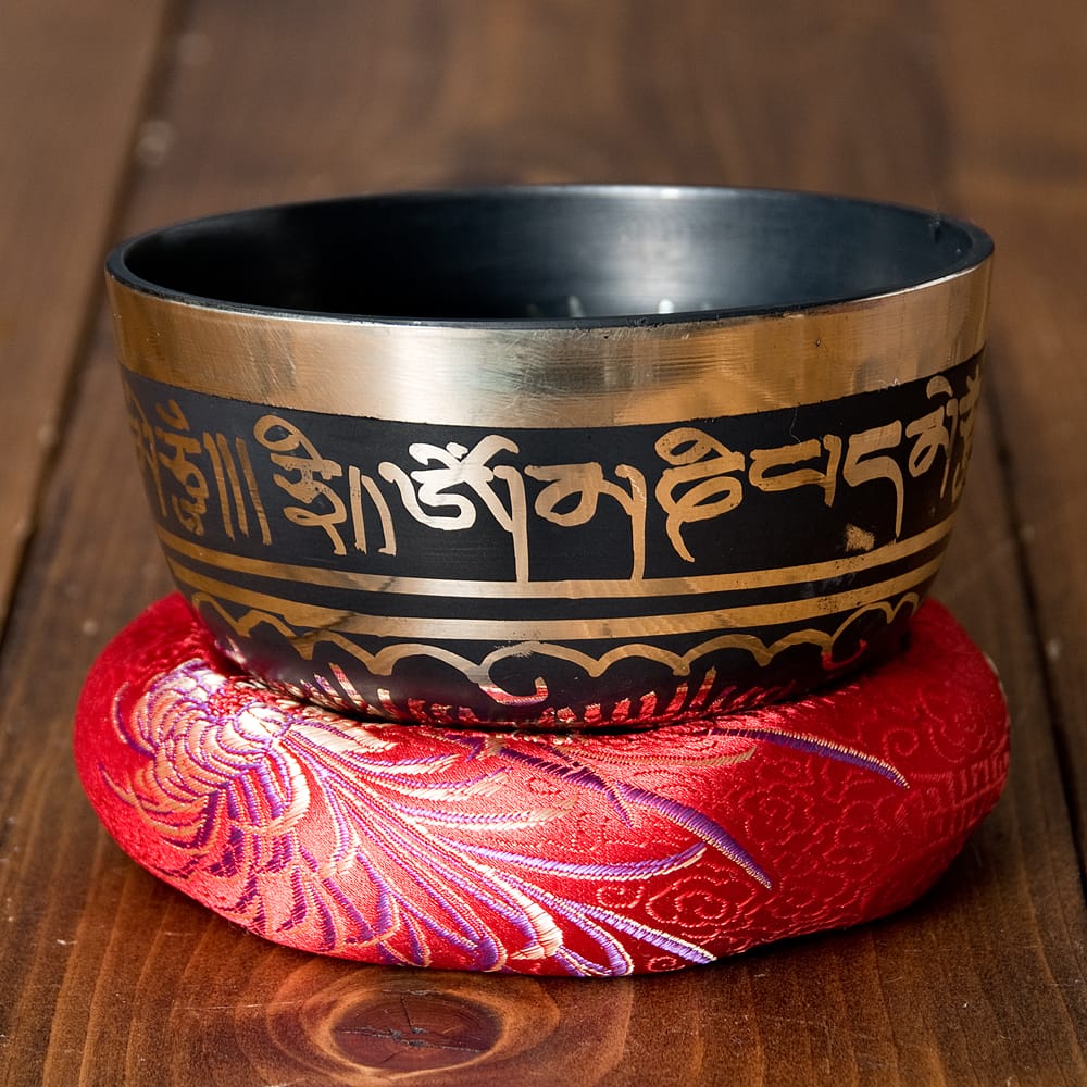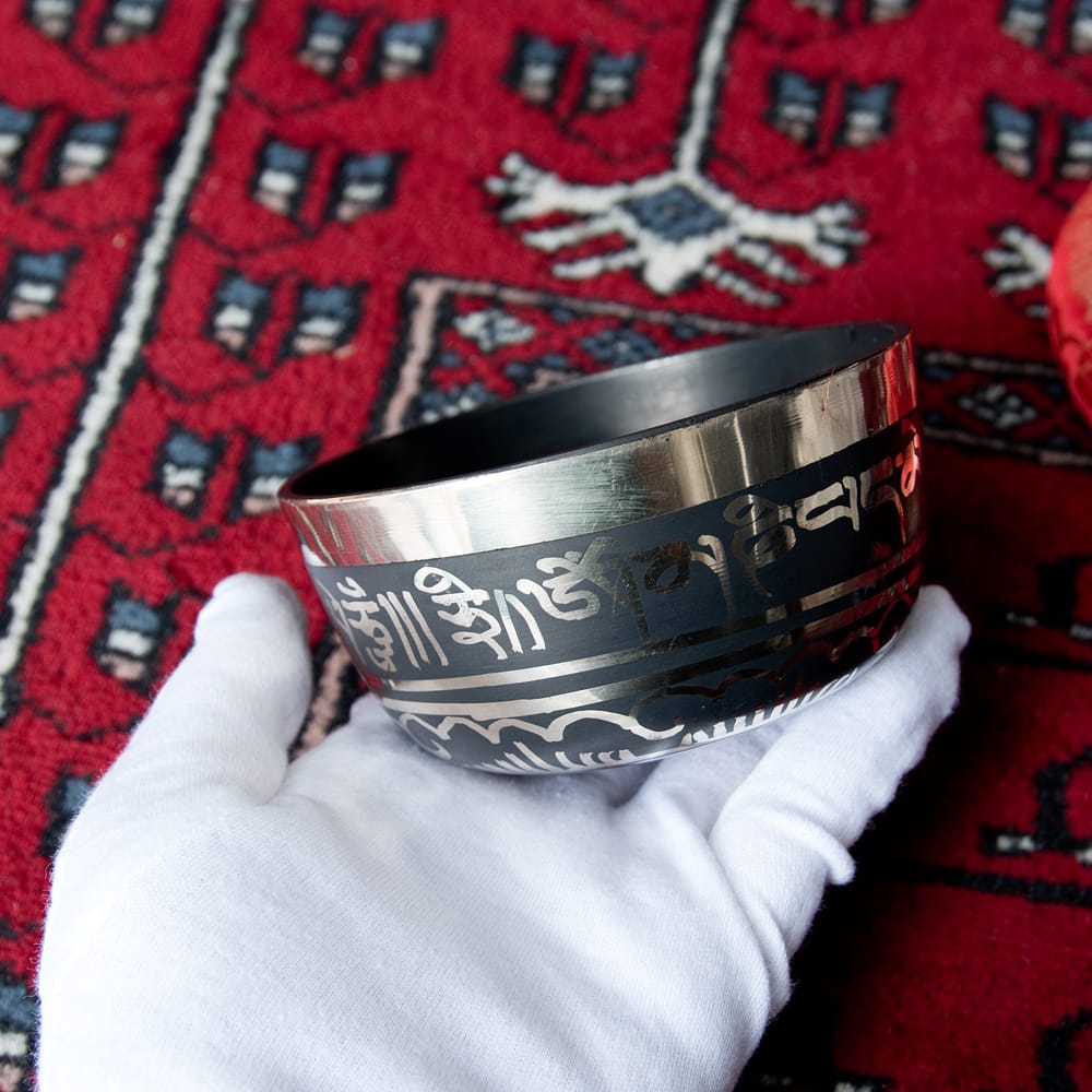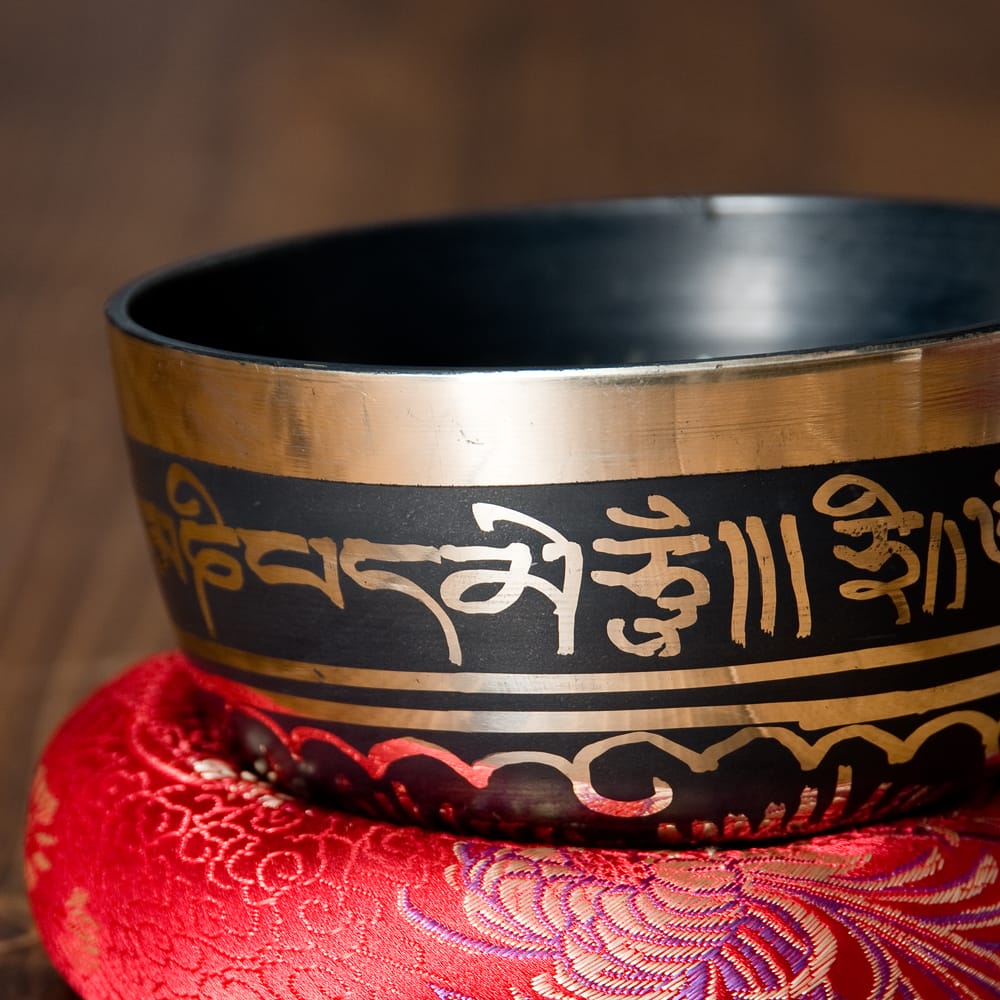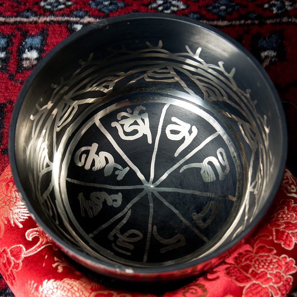 こちらのシンギングボウルは、高音質のシンプルシンギングボウルに模様を施した物で、写真下の再生ボタンから試奏した際の実音をお聞きになれば分ると思いますが、とても澄んだ音と安定した倍音が鳴りやすい一品です。職人によって施された装飾は、触れた時の手触りも良いです。マントラや、ヴィシュヴァ・ヴァジュラ、アグニ、シャンカなどのチベット吉祥文様に加え、ブッダやオーン、オンマニペメフム、ロータスなどが美しく彫られています。
