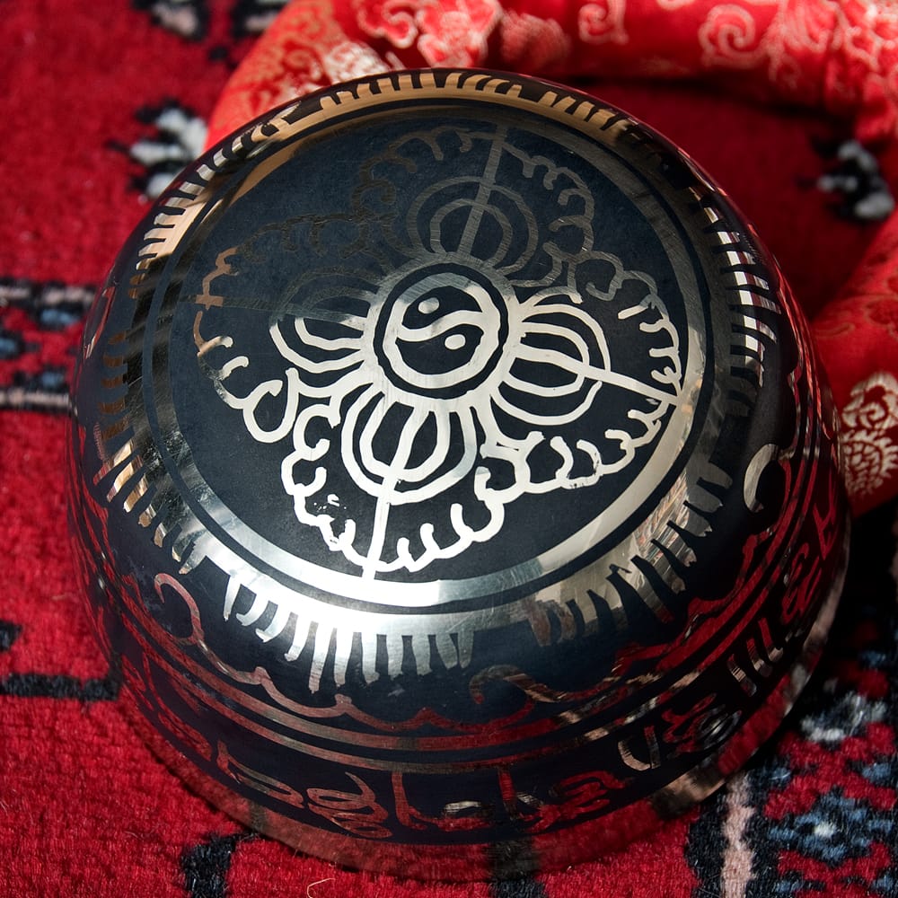 高音質タイプに、チベット吉祥柄などの文様を施したブラックシンギングボウルです。鳴らしやすさと見た目の良さが魅力の一点もの。写真一番下の再生ボタンから、実音の試聴が可能です。(写真の台座は付属いたしません)