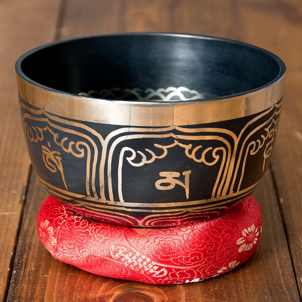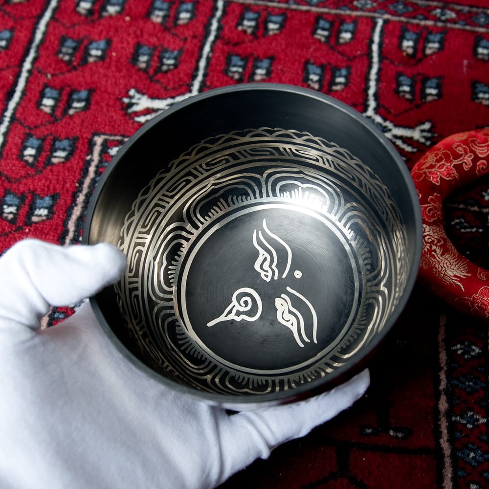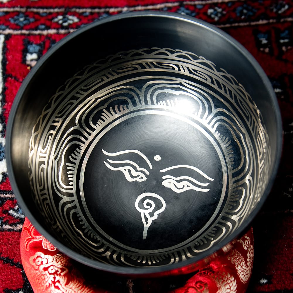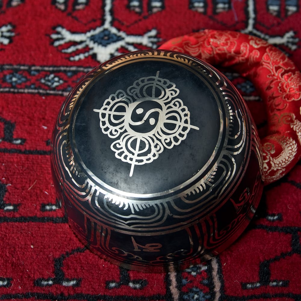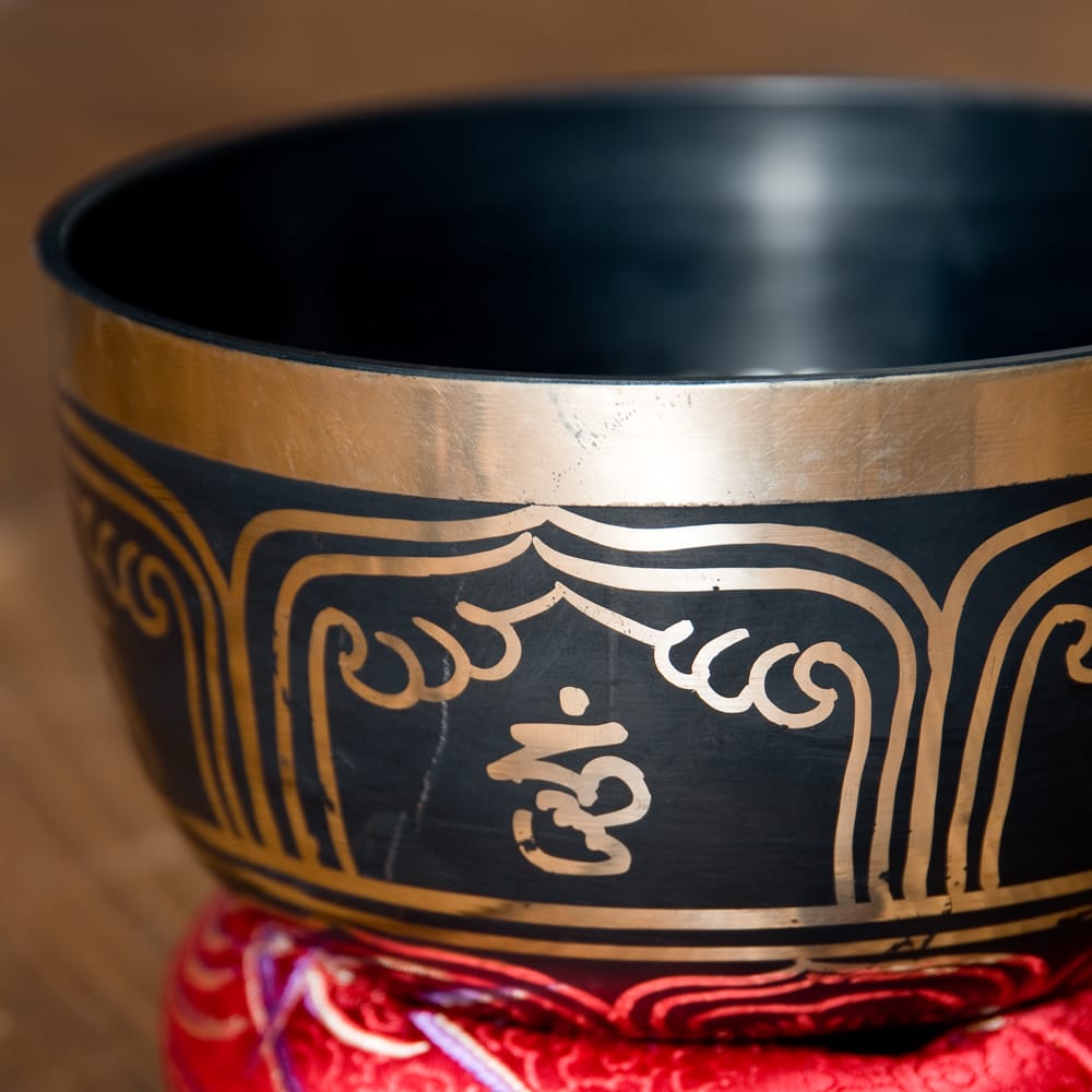 高音質タイプに、チベット吉祥柄などの文様を施したブラックシンギングボウルです。鳴らしやすさと見た目の良さが魅力の一点もの。写真一番下の再生ボタンから、実音の試聴が可能です。(写真の台座は付属いたしません)