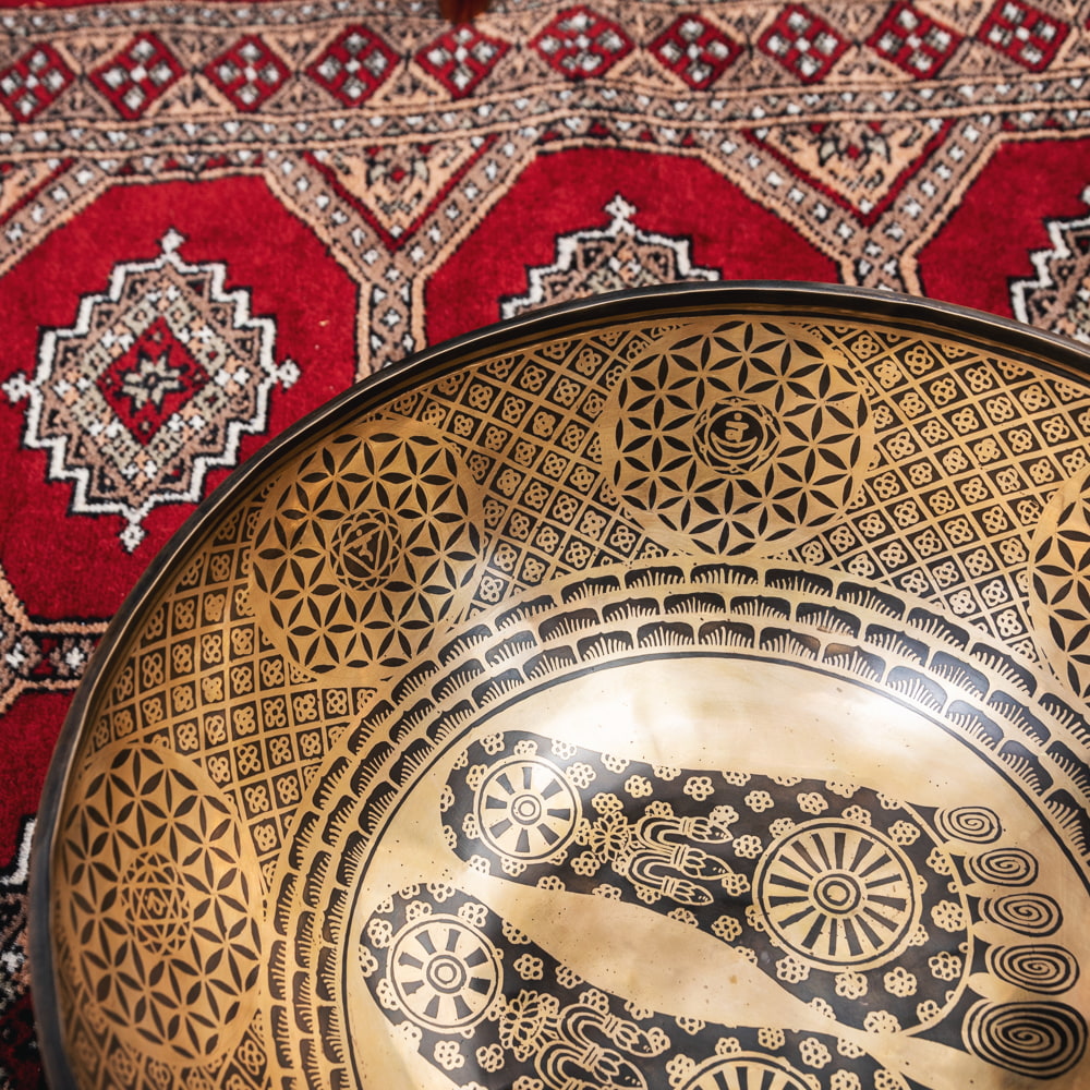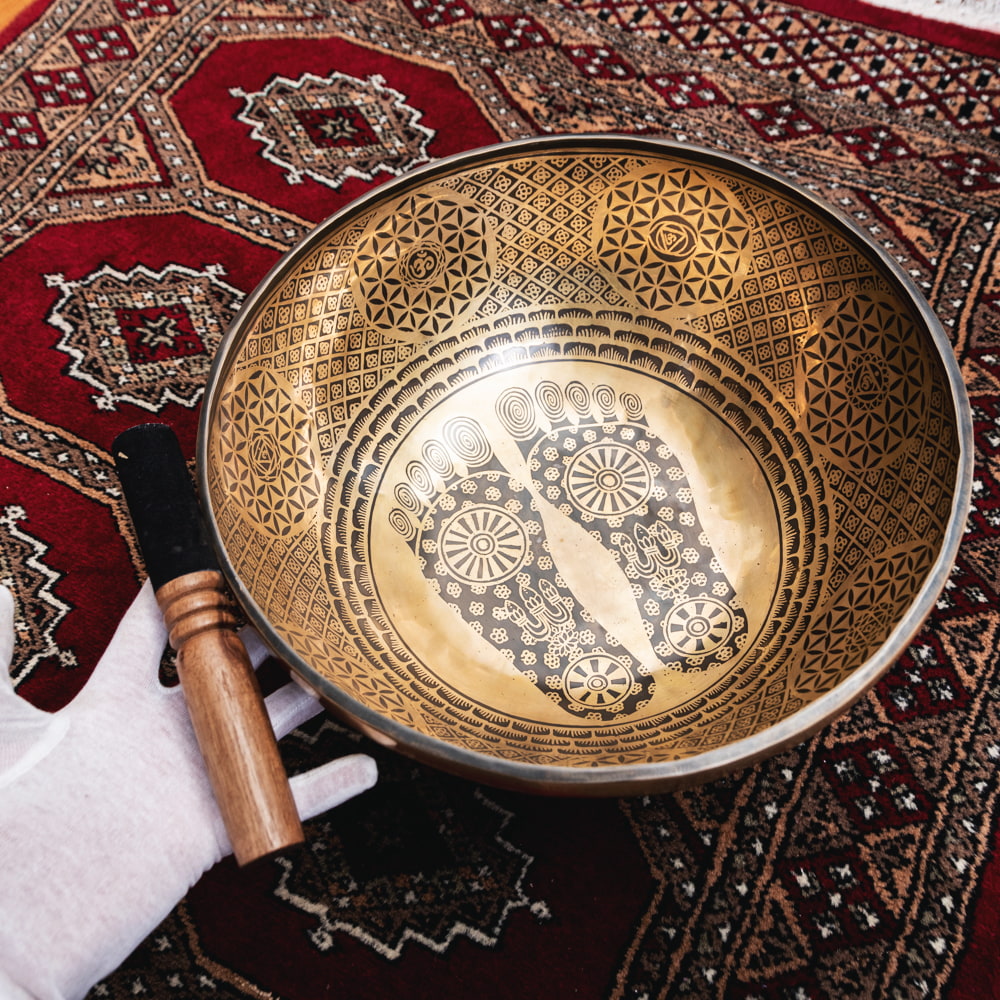 深みのある音色に加え特徴的なのが、職人によって手彫りされた美しい文様です。マントラや、ヴィシュヴァ・ヴァジュラ、アグニ、シャンカなどの吉兆柄に加え、ブッダなどが美しく彫られています。特に、シンギングボウルの内側に施された模様は、通常品よりも丁寧に細密彫りされていて、とても良い雰囲気。全ての柄をご覧いただけるよう、底面を含め写真に収めておりますので、是非御覧くださいませ。音色だけではなく、視覚的にも楽しく癒してくれる一品です。