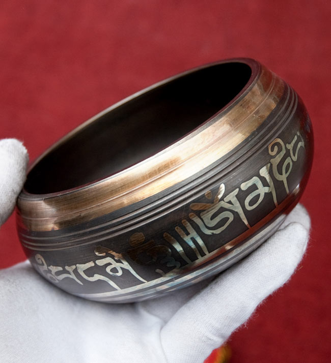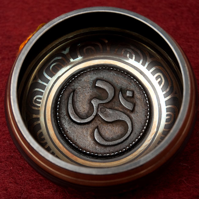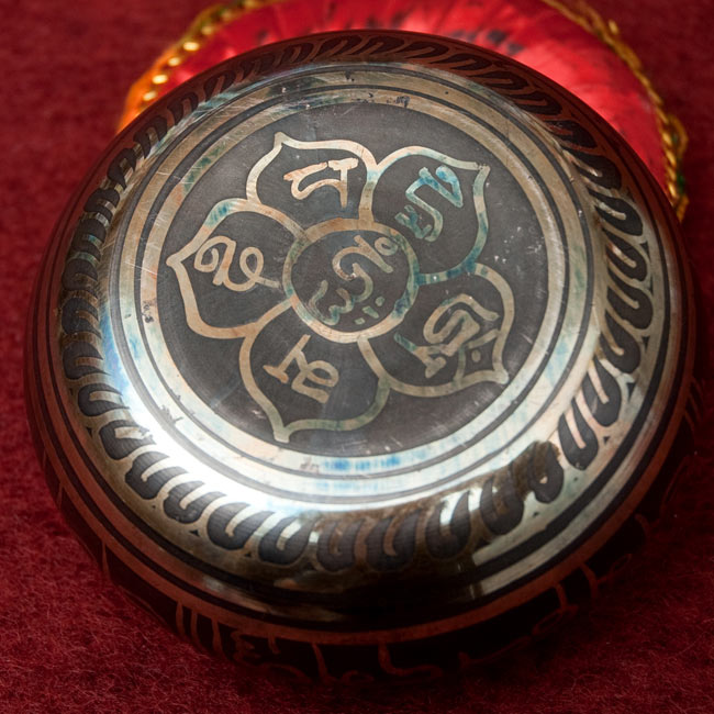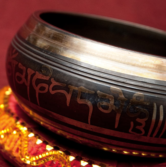 職人によって施された美しい金色の装飾は、触れた時の手触りも良いです。マントラや、ヴィシュヴァ・ヴァジュラ、アグニ、シャンカなどの吉兆柄に加え、ブッダやオーン、オンマニペメフム、ロータスなどが美しく彫られています。全ての柄をご覧いただけるよう、底面を含め写真に収めておりますので、是非御覧くださいませ。音色だけではなく、視覚的にも楽しく癒してくれる一品です。■シンギングボウルの鳴らし方について■