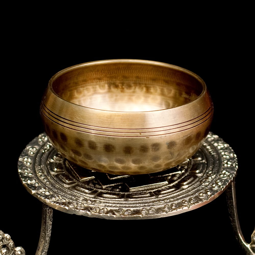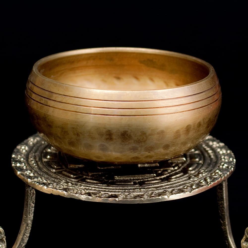 金色に茶色が混ざりあったような美しい色合いのシンギングボウル。なにより一番の特徴は、シンギングボウル全体に施された、ハンマーによる槌目模様です。