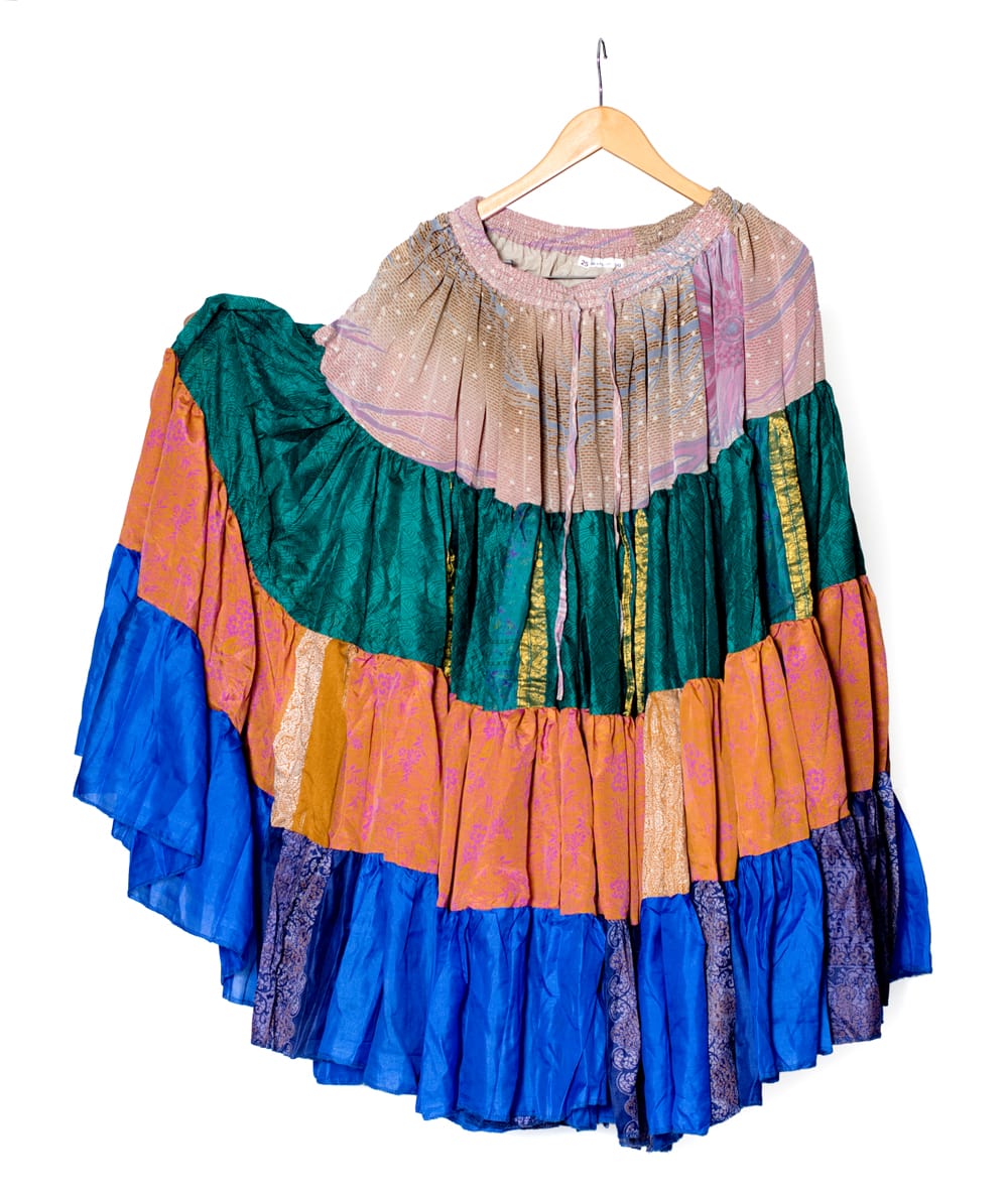 使われているサリー生地は層のようにトータル4種類。それぞれをつなぎ合わせたパッチワークになっています。さらに、アンティークサリーなので、それぞれが同じ組み合わせのない一点もの。自分だけの特別な1枚になりますよ。また、お送りするスカートは、ハンガーに掛けて片方を広げてある写真一枚目の物となります。