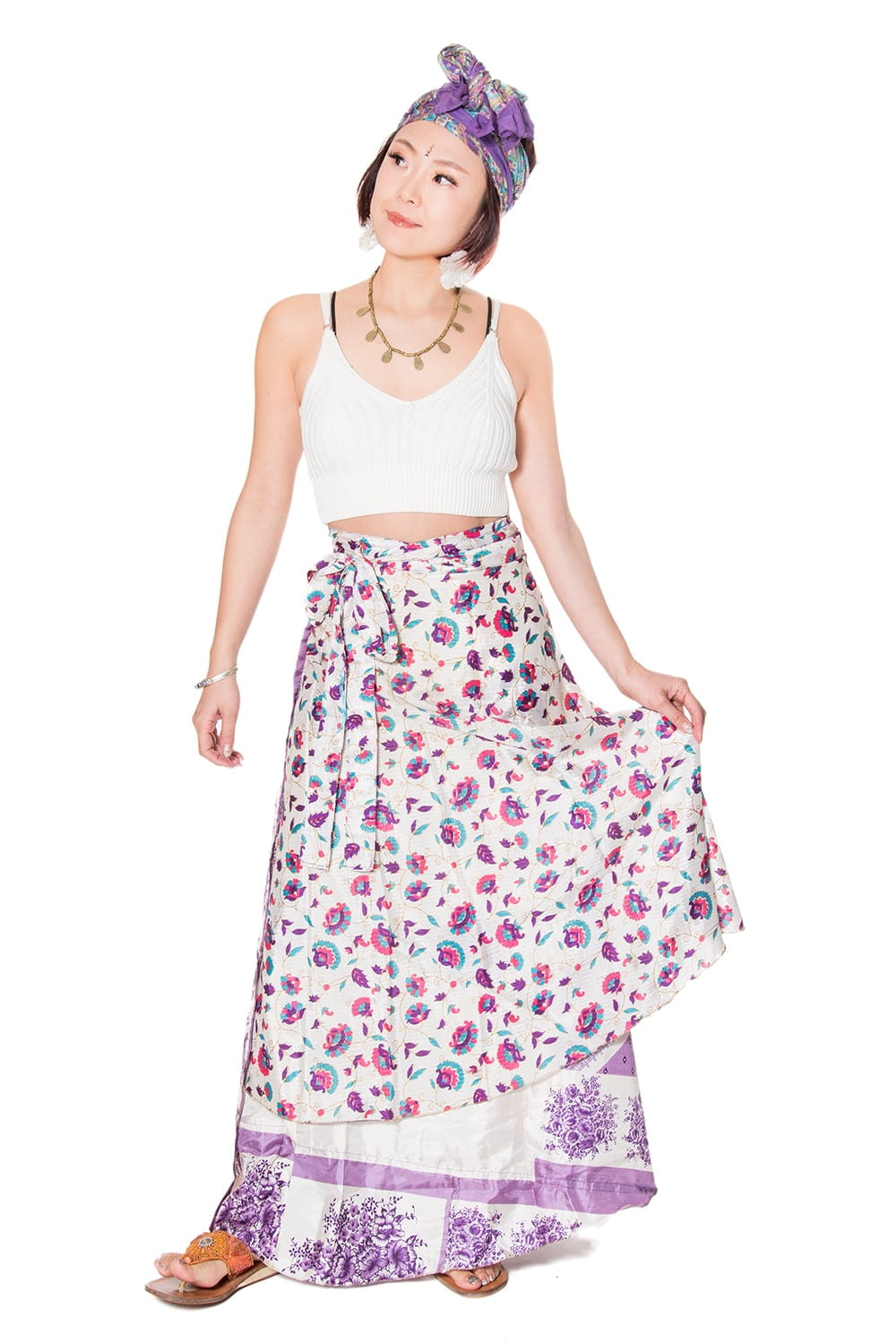 20通り以上の着方が出来る! そんな驚きのスカートが登場しました!ちょっと見はインドのオールドサリーを使ったラップスカートなのですが、紐を通すための穴があいていたり、布が2重になっていて不思議な作りになっています。当然、巻けばラップスカートになるのですが、他にもワンピース風になったり、キャミ風になったりと変幻自在!