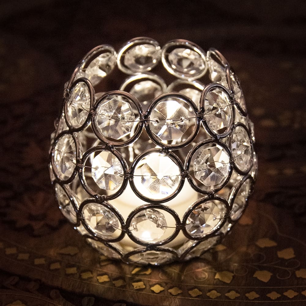 たくさん取り付けられたクリスタルが光を受けてキラキラと輝くキャンドルホルダーが届きました。 クリスタルをワイヤーで一つ一つ編み込んで取り付けられており、手の混んだ一品です。日中は太陽の光を受けて、夜はキャンドルの灯りをクリスタル反射して周りに拡散させます。 柔らかい光が広がってとってもロマンティックで寝室やリビングなど雰囲気作りにぴったりです。 メタルのフレームでクリスタルが一層引き立ちゴージャスなデザインに仕上がっています。