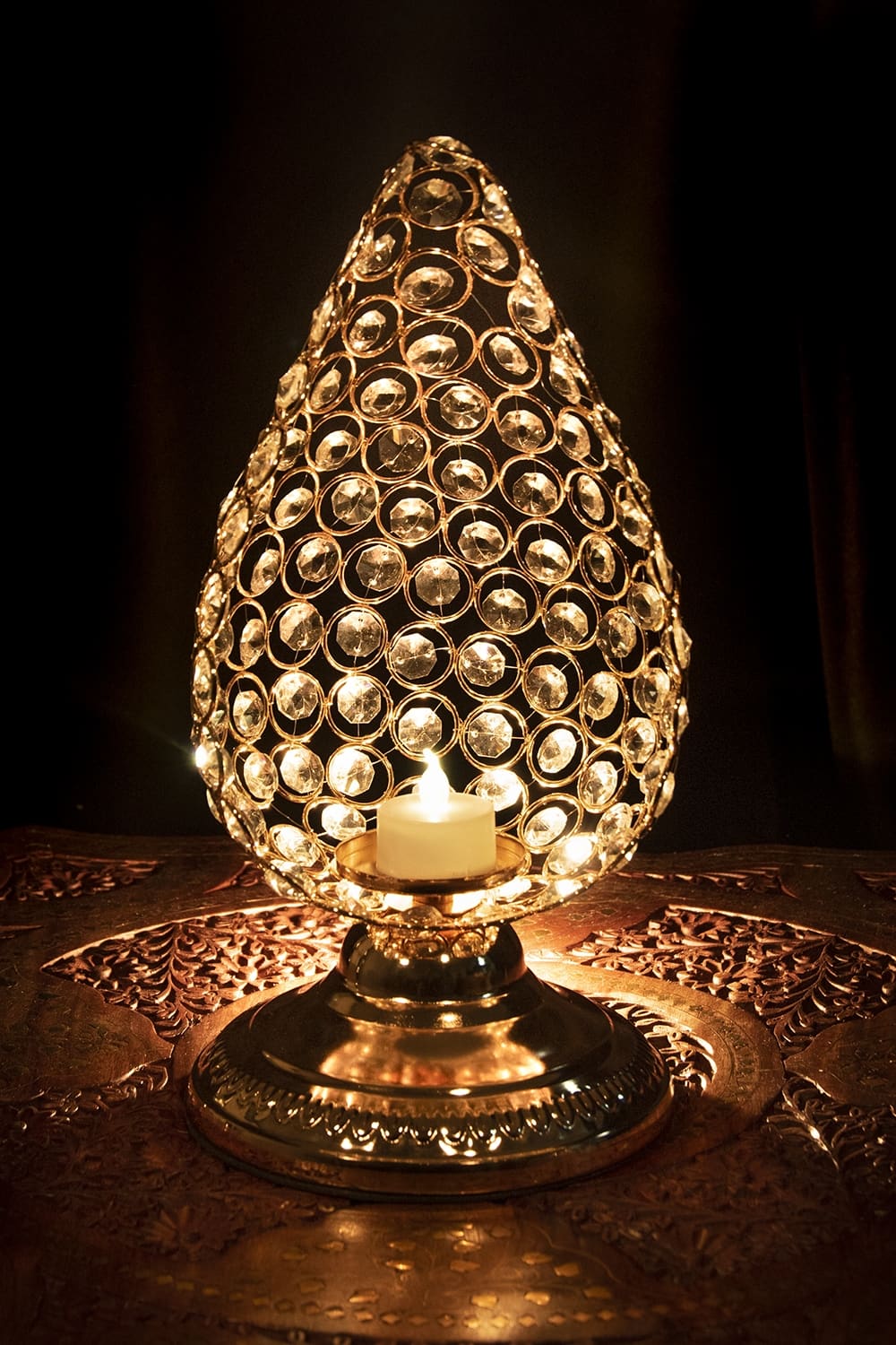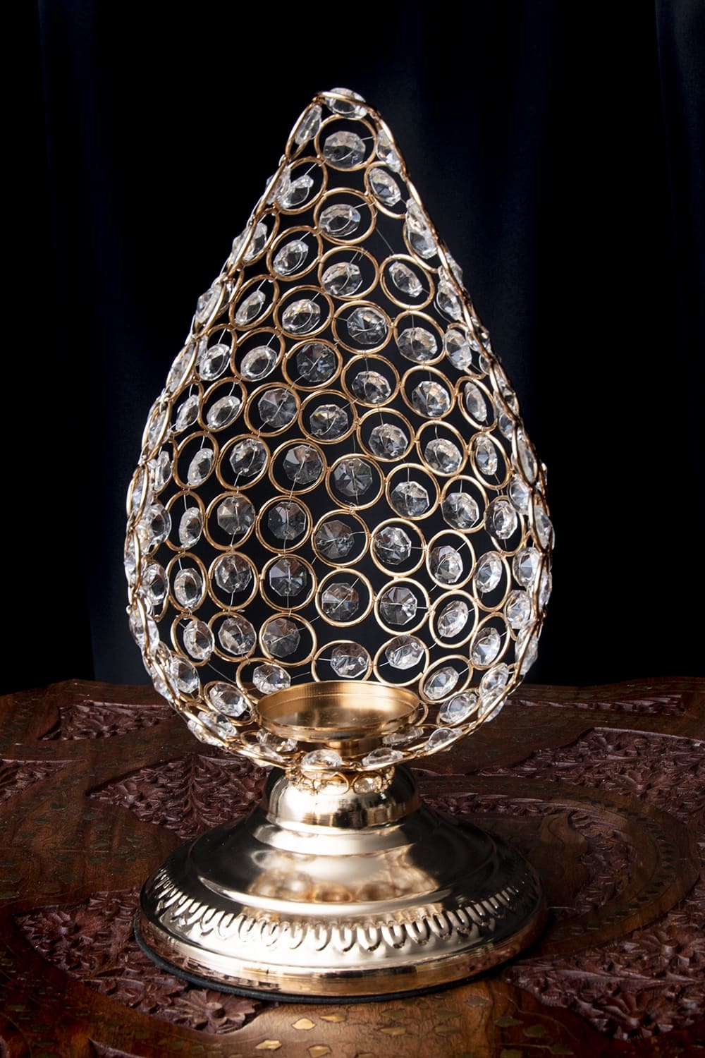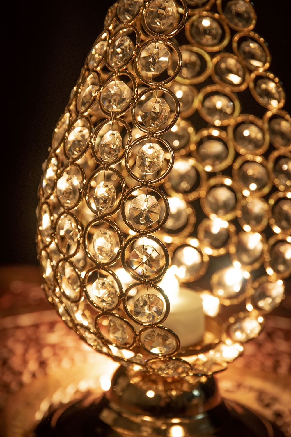 たくさん取り付けられたクリスタルが光を受けてキラキラと輝くキャンドルホルダーが届きました。 クリスタルをワイヤーで一つ一つ編み込んで取り付けられており、手の混んだ一品です。日中は太陽の光を受けて、夜はキャンドルの灯りをクリスタル反射して周りに拡散させます。 柔らかい光が広がってとってもロマンティックで寝室やリビングなど雰囲気作りにぴったりです。 メタルのフレームでクリスタルが一層引き立ちゴージャスなデザインに仕上がっています。