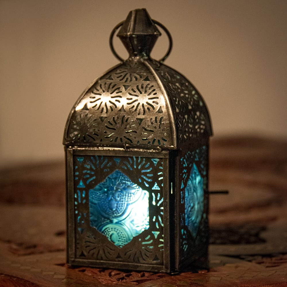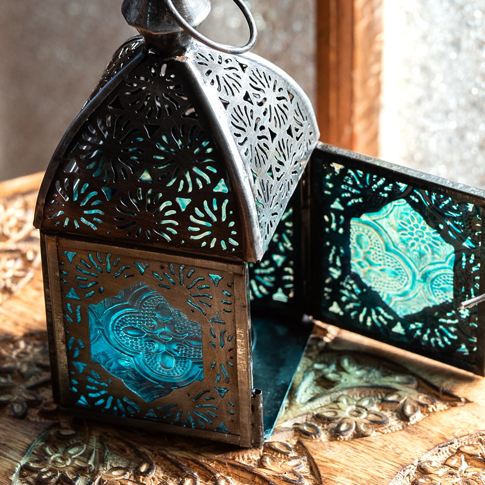LEDのキャンドルライトなどを中に入れる為のランタンです。底の部分または横の部分に開口部があり、そちらからライトを出し入れできるように作られています。装飾の入った色とりどりのガラスが周りに付いていて、ガラス越しに見えるキャンドルライトの明かりはとても綺麗。上部に開いている穴からも明かりがこぼれ、壁に投影される影を見ていると癒やされます。使っていない普段もガラスが綺麗でインテリアとして映えて素敵です。