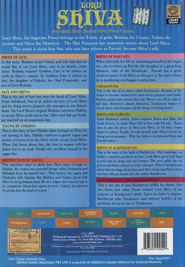 ヒンドゥー教の最高神として熱狂的な信仰を集めているシヴァ神。シヴァ神に関する神話はそれこそ星の数ほどありますが、中でも有名なお話をピックアップしてアニメ化したのが、こちらの作品。最初の妻・サティーとの出会いと別れ、悲しみにうちひしがれるシヴァ、そしてパールヴァティとの出会い…。その他様々な神話をアニメで楽しむことができます。1話ずつが短いので、気軽に見ることができます。音声と字幕は英語になります。それにしてもパッケージのイラストとアニメの作画のギャップはなんなのでしょうか…。