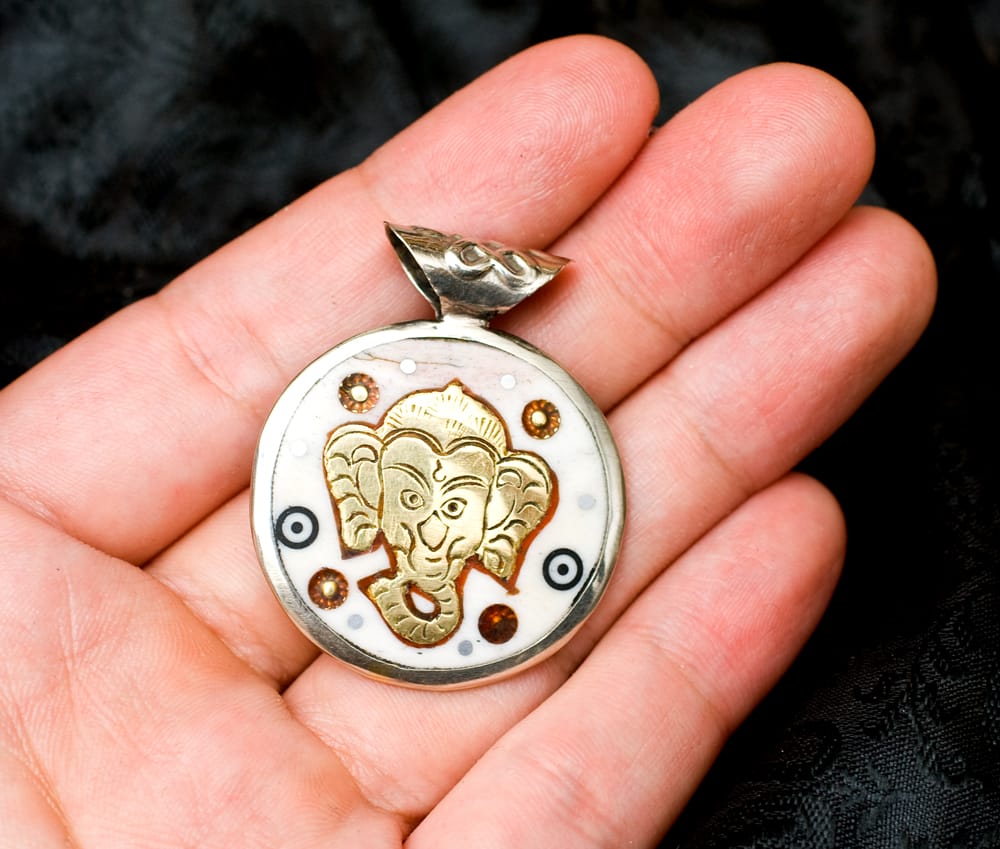 ガネーシャと太陽のペンダントトップの写真ガネーシャと太陽のペンダントトップ 2 - 裏面の写真ですガネーシャと太陽のペンダントトップ 3 - 紐を通す部分を写してみましたガネーシャと太陽のペンダントトップ 4 - 手に持ってみましたガネーシャと太陽のペンダントトップ 5 - 紐を通すとこのような感じになります(このイメージはID-ACS-258のものになります)