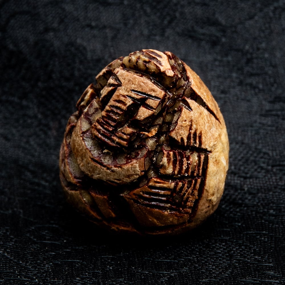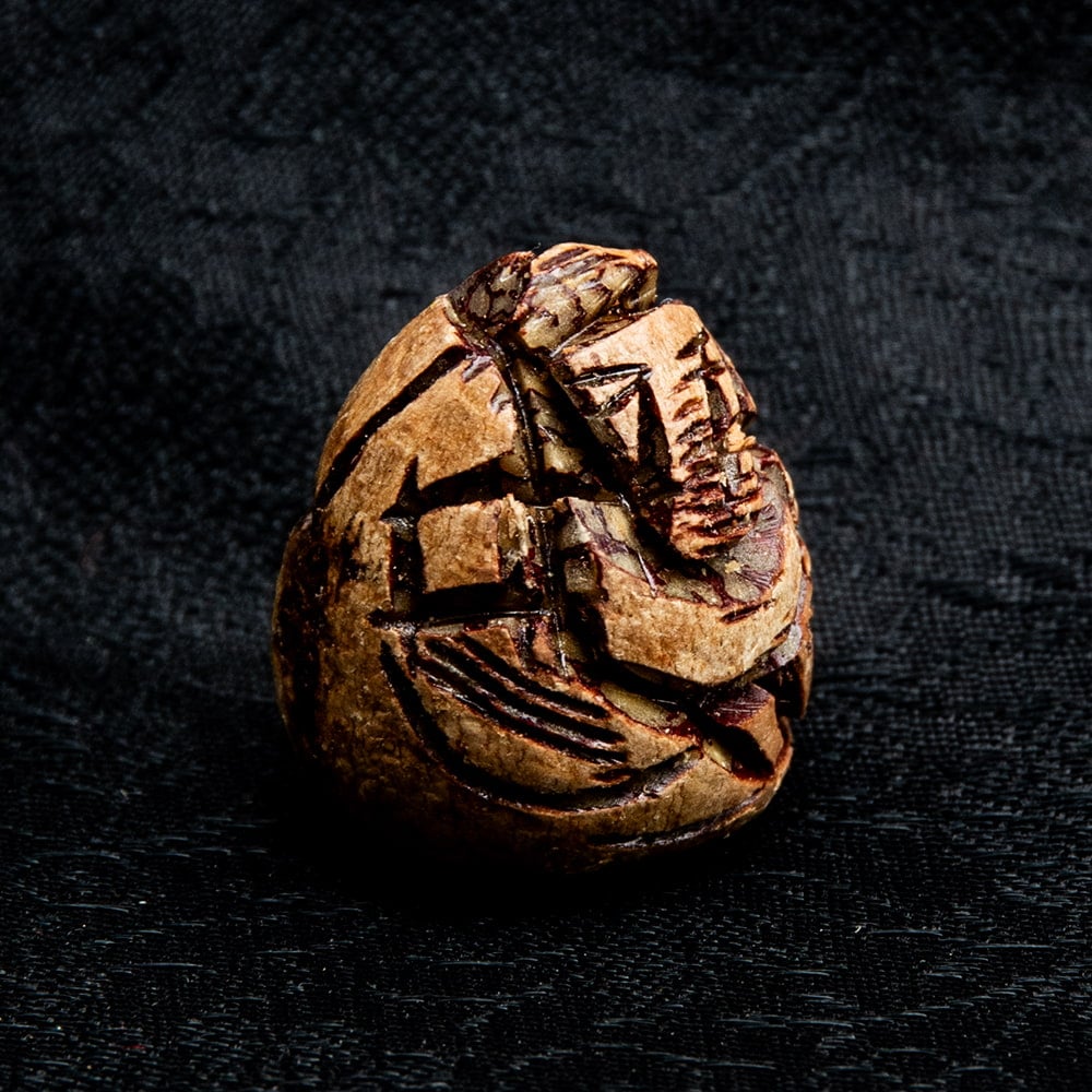 インドや東南アジアで広く親しまれているキンマの実に、ガネーシャ像を手で彫り込んだ珍しい一品です。キンマの実は広く南アジア、東南アジアで嗜好されていますので、各国で名前が異なり、ベテルナッツ、ビンロウジュ、檳榔、パーンなどと呼ばれています。