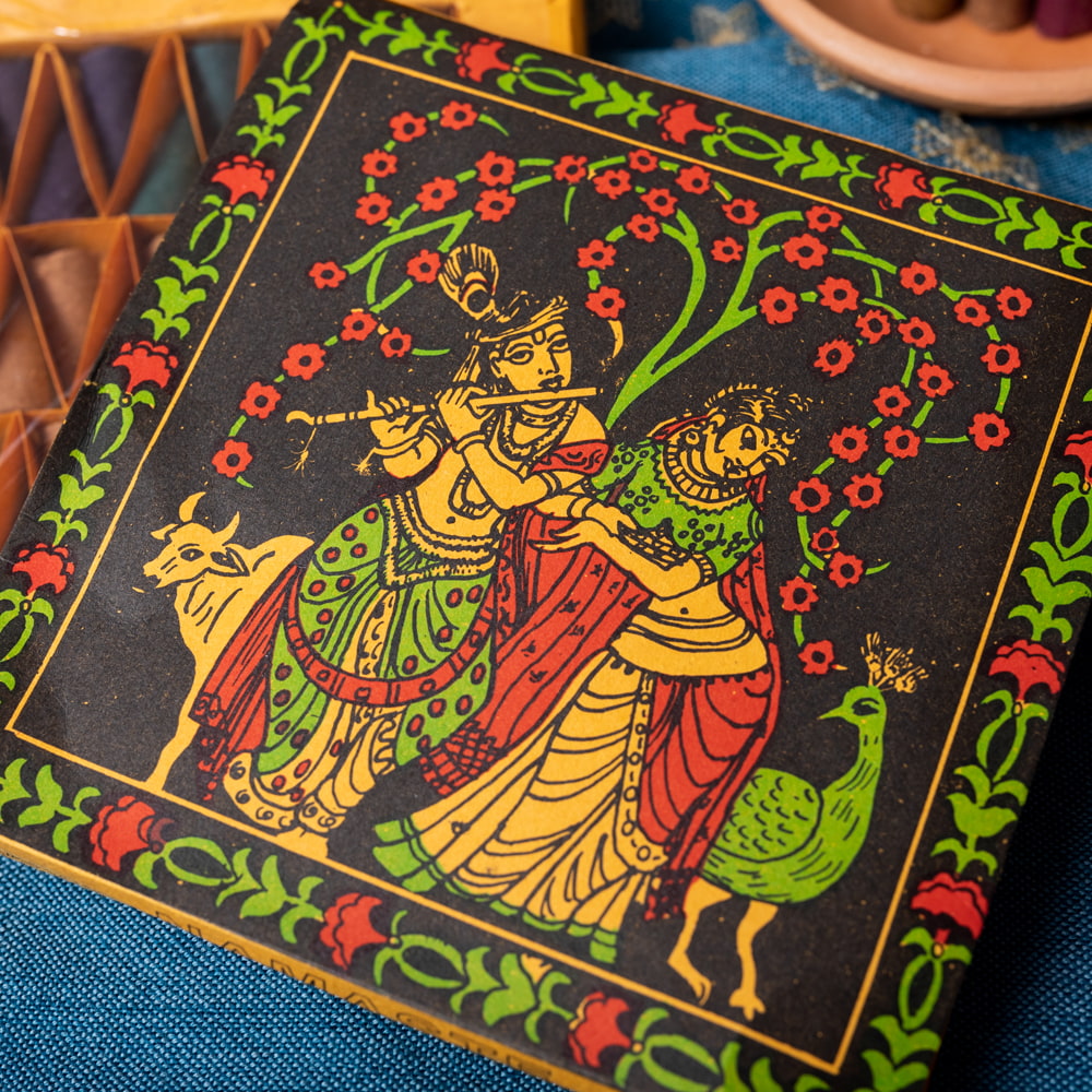 ヒンドゥー教の最高神であるヴィシュヌの7番目の化身といわれるクリシュナ。ビシュヌの化身の起源ともいわれ、強くて男前な、いわゆるプレイボーイの神様です。そんなクリシュナと恋人の娘、牛飼いのラーダと並んだパッケージ。ヴィシュヌの化身のクリシュナに対し、ラーダはラクシュミーの化身とされています。「ギータ・ゴーヴィンダ」という二人を描いた叙事詩もあり、男女愛の象徴とされている二人です。