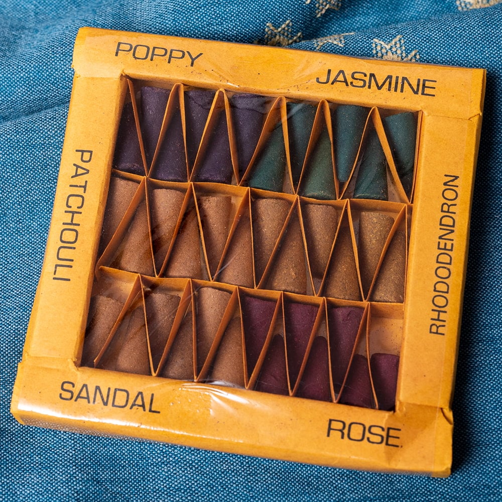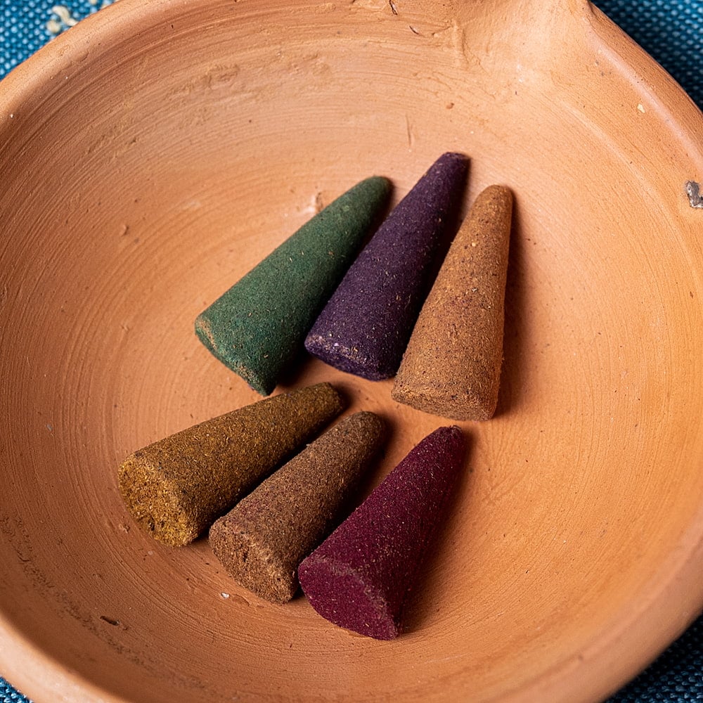 こちらのNAMASTE香は、インドの伝統的な製法で作られたお香です。サンダルウッド、樹脂、ハーブ、天然の花から抽出した香り豊かな芳香油を加え、手作りのウッドブロックでコーンの形を型取り、ハンドメイドされております。■6種の香りが楽しめます