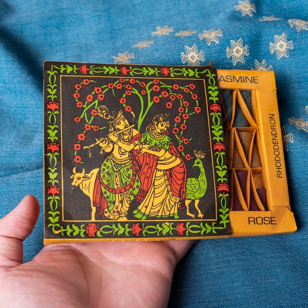 こちらは、ポピー、ジャスミン、パチュリ、ロードデンドロン(シャクナゲ)、サンダルウッド、ローズと6種類の香りが楽しめます。それぞれ6個ずつ入っているので、合計で36個入り!複数の香りが入っているので、一つで沢山の香りを楽しむことができるお香セットです。■英雄クリシュナ