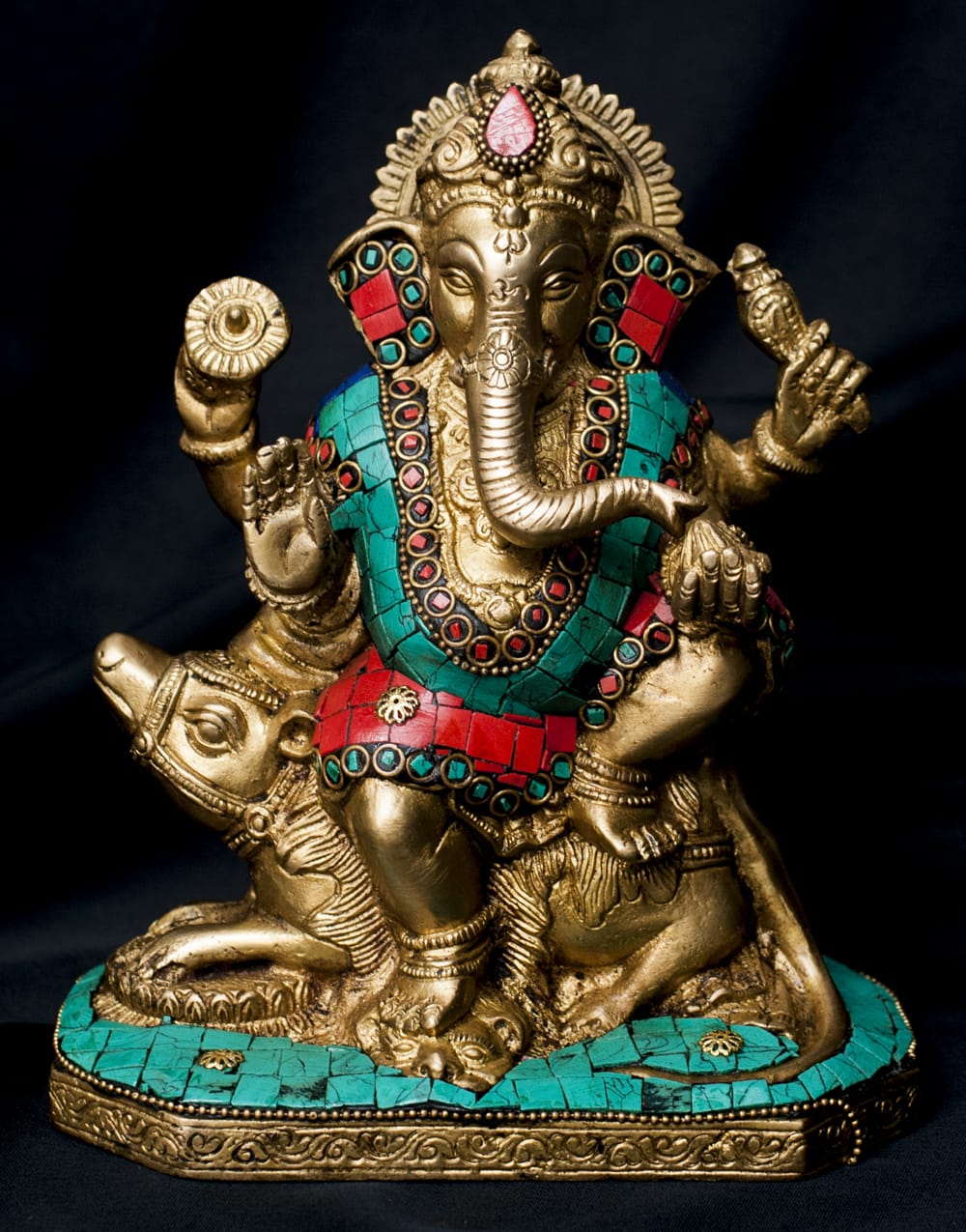 緑青石で美しく装飾されたガネーシャ像がインドから届きました。重厚な質感のあるブラスを素材に象られたガネーシャは存在感もたっぷり。インドの職人が心血を注ぎ、石を小さく刻んで埋め込んだ極めつけの仕上がり。像そのものの造形も奥深く、見るたびに細部に新たな発見のある芸術的な逸品です。■学問・金運の神様 ガネーシャ