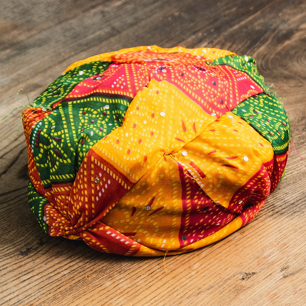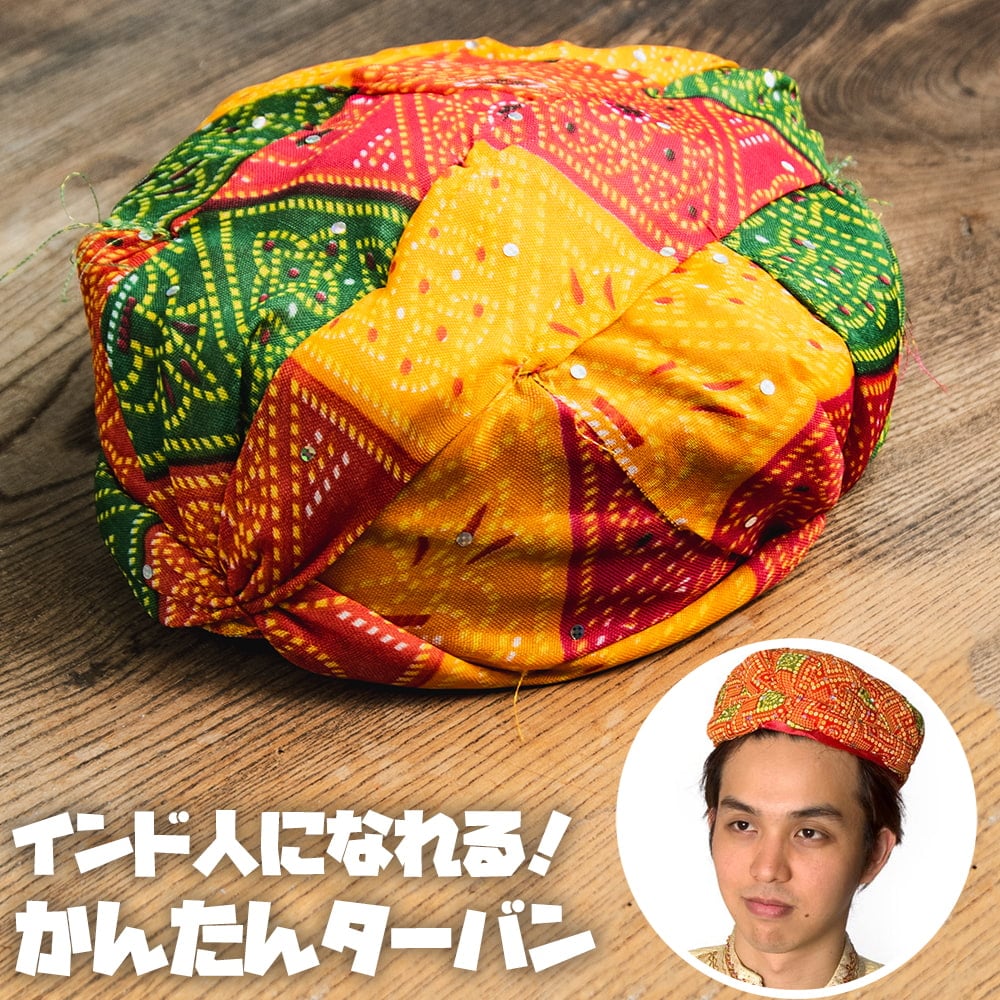 これぞインドアホアイテムの真骨頂、インスタントターバン!!本格ターバンはぐるぐると何周も布地を頭に巻き付けなければいけないのですが、こちらはひょいと頭に乗せるだけのめちゃシンプルな便利グッズです。イベント用に、結婚式用に…いろいろなシチュエーションで個性豊かな表現ができますね。どこにいても目立つこと間違いなしです!デザインはラジャスタン地方を彷彿とさせるイメージ。しっかり被るというよりは頭にちょこんと乗せるイメージになります。