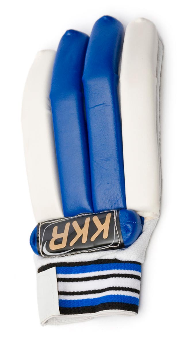 このグラブはバッター用のグラブです。高く跳ね上がったボールから手を守るために、バッターはこのグラブをつけます。手の甲の側は分厚くなっていますが、手の平の側はバットを握りやすくするため薄くなっています。
