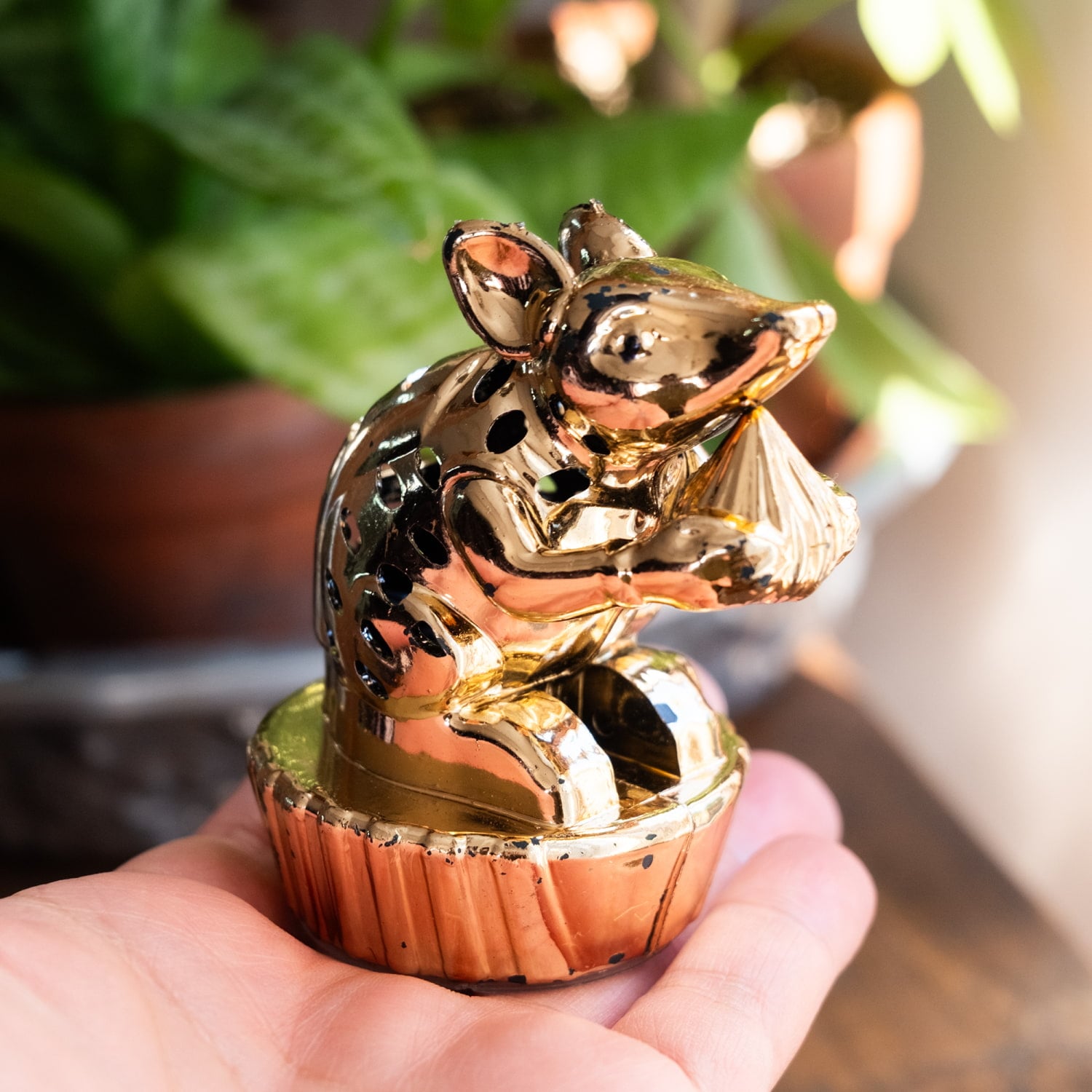 ガネーシャの相棒として知られるネズミ「ムーシカ」をモチーフに、つややかなゴールドメッキで仕上げられています。