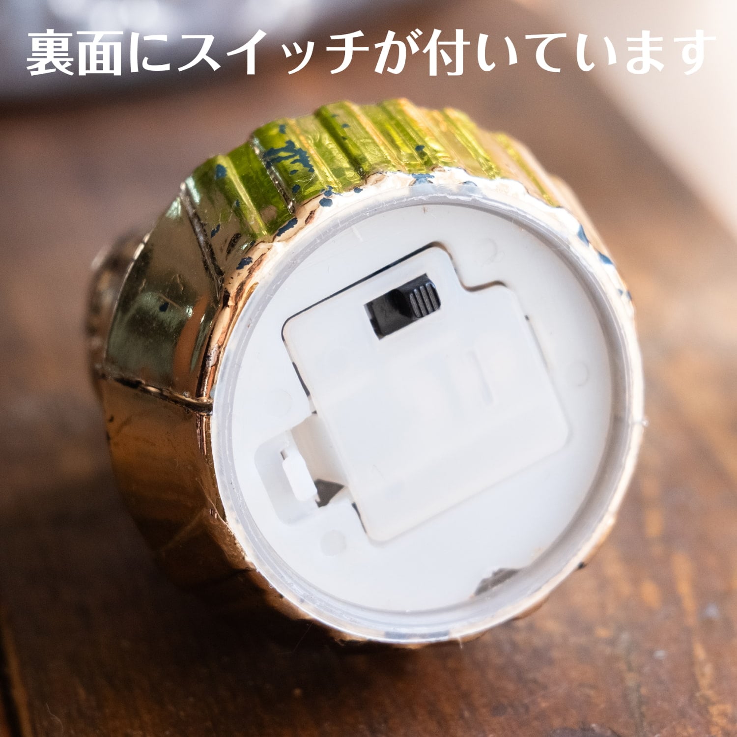 LEDを内蔵しているので、裏面のスイッチを押すと光り輝きます。ボタン電池は内蔵しているので、すぐにご使用いただけます。