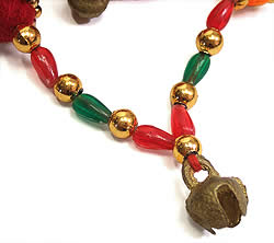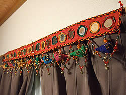 この飾りのれん、ドアや棚戸、壁、天井、トイレなど、場所を選ばず色々なところに飾ることができ、お部屋をインドっぽくアレンジするのに重宝します。同じ色のものをいくつも繋げてお部屋を360度飾ってしまうのもアリかもしれませんね。上端の5箇所に、引っ掛けるためのわっかがついているので、そこに細い棒を通すか、フックなどにかけるなどして、お使いいただけます。