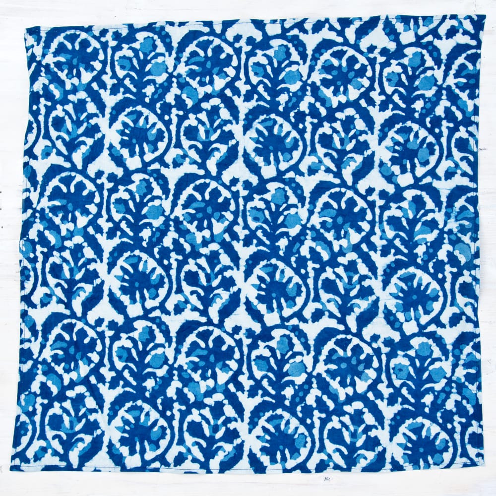 インドには手で彫った木版を、手でスタンプして作り上げるウッドブロックという技法があります。現在の日本では布はまるで新聞が印刷されるようにしてプリントされていきますが、その昔、高度な印刷機などを持たなかったインドの人々は自分たちの手で自分たちの布を綺麗に染めようと、木版を考えだしたのでした。このハンカチはウッドブロックプリントを使って、昔ながらの手法で作られた一品です。インドの女性たちが大好きな小花やつる草の模様、淡い色彩、手作りならではのちょっとずれた柄が、はるか遠くの大地を思わせます。小さな布ですが、その中にも伝統と大陸の美意識が詰まっています。