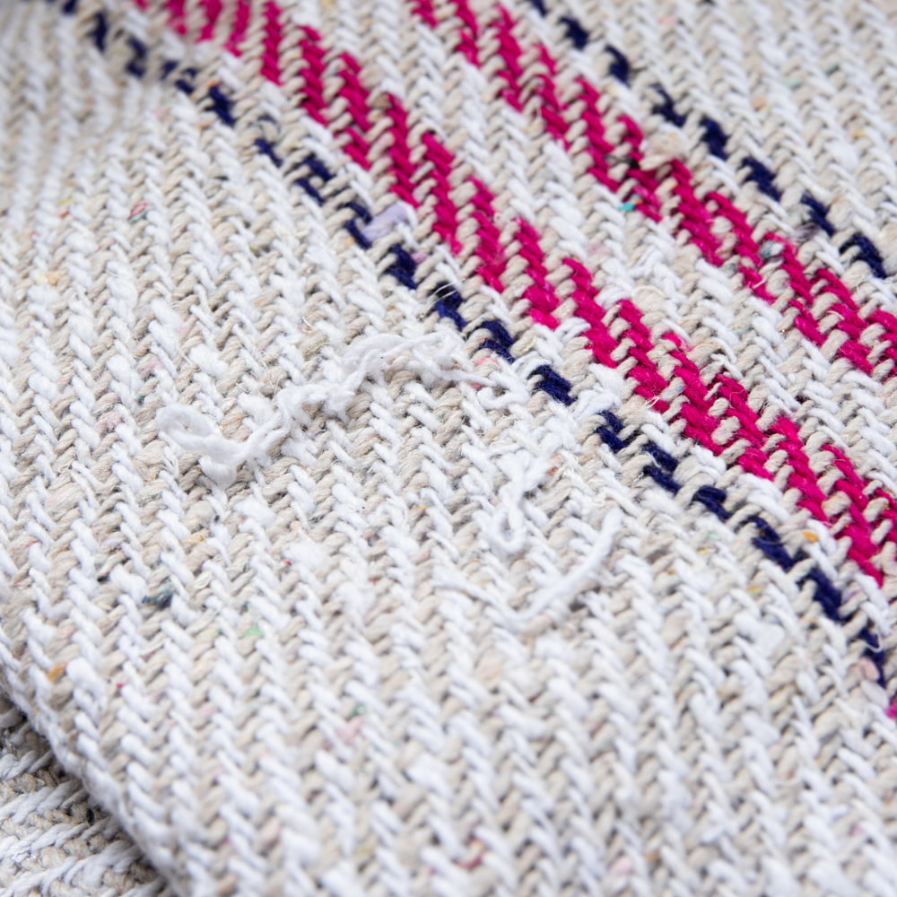 インドのシンプルな生活感あふれる、雑巾・ダスターです。リサイクル糸を使用しているため、コットンの厚みや、目の粗さ、サイズ感など全体的な雰囲気などがざっくりインドを感じさせる一品です。縫製は雑で、生地にもほつれがあったりと、本当にインドの一般庶民が使っているそのまんま。現地ではモップの先端に付けて雑巾がけにしたり、オートリキシャのウィンドウやシートをサッと拭けるように積まれていたり、本当に日常生活の様々なシーンで使用されています。