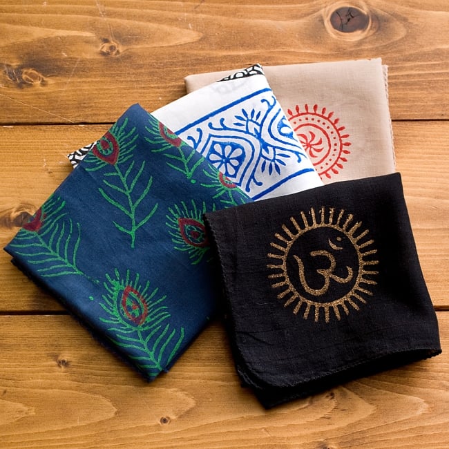 ずいぶん前に購入したハンカチが洗いすぎて色あせてしまいました。なので、柄違いで、3枚購入しました。生地が少し柔らかめもあり模様によって生地厚が違うのかな~と。この商品は、ハンカチの他に、頭に巻いて使用することが多いいです。頭周りが小さいので帽子が緩いのです。これを使うと汗止めにもなりますし、帽子を脱いでも模様が素敵なのでお洒落にみえます。それと、首に巻いても、束ねた髪にリボン代わりにしても、お洒落です。インド綿なのでお肌にとっても優しいです。