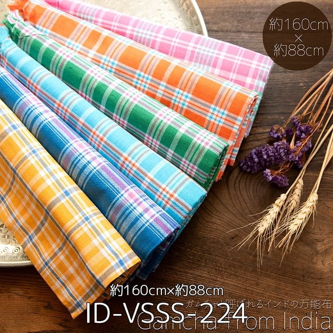 インドの生活感あふれる布、ガムチャと呼ばれる万能布で日本で言う手ぬぐいのような布です。シンプルでざっくりと編まれた鮮やかなチェック柄が可愛く、様々な用途にお使いいただけます。 現地では、祭壇に使用したり、頭に巻いたり、手拭きにしたり。色やサイズに合わせて何にでも◎ざっくりと編まれているから速乾性にも優れており、使えば使うほど、洗えば洗うほど生地が馴染んで柔らかくなってきます。お皿を拭いたり、目隠し布やランチョンマットのように広げて使用しても◎また、大きめサイズならクーラーの風よけや日焼け防止にも使用できます。