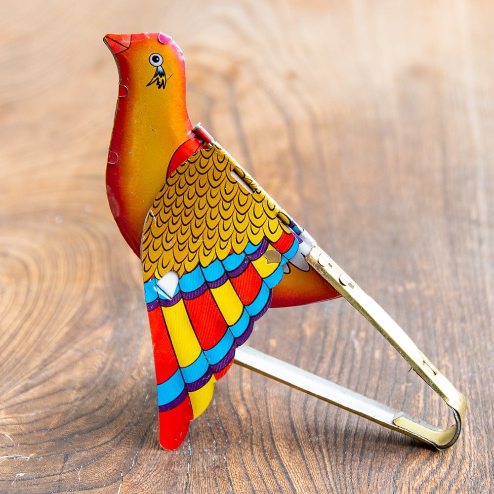 インドからやってきた、カラフルな鳥のおもちゃです。羽根の部分にアコーディオンと笛が仕込んであって、手でもつとピヨピヨと愛らしくさえずります。インドで交通渋滞にはまると物売りの少年などが近寄ってきて停車中のリクシャに売りに来たりするのですが、可愛らしくてついつい仕入れちゃいました!■作りや品質はインド製