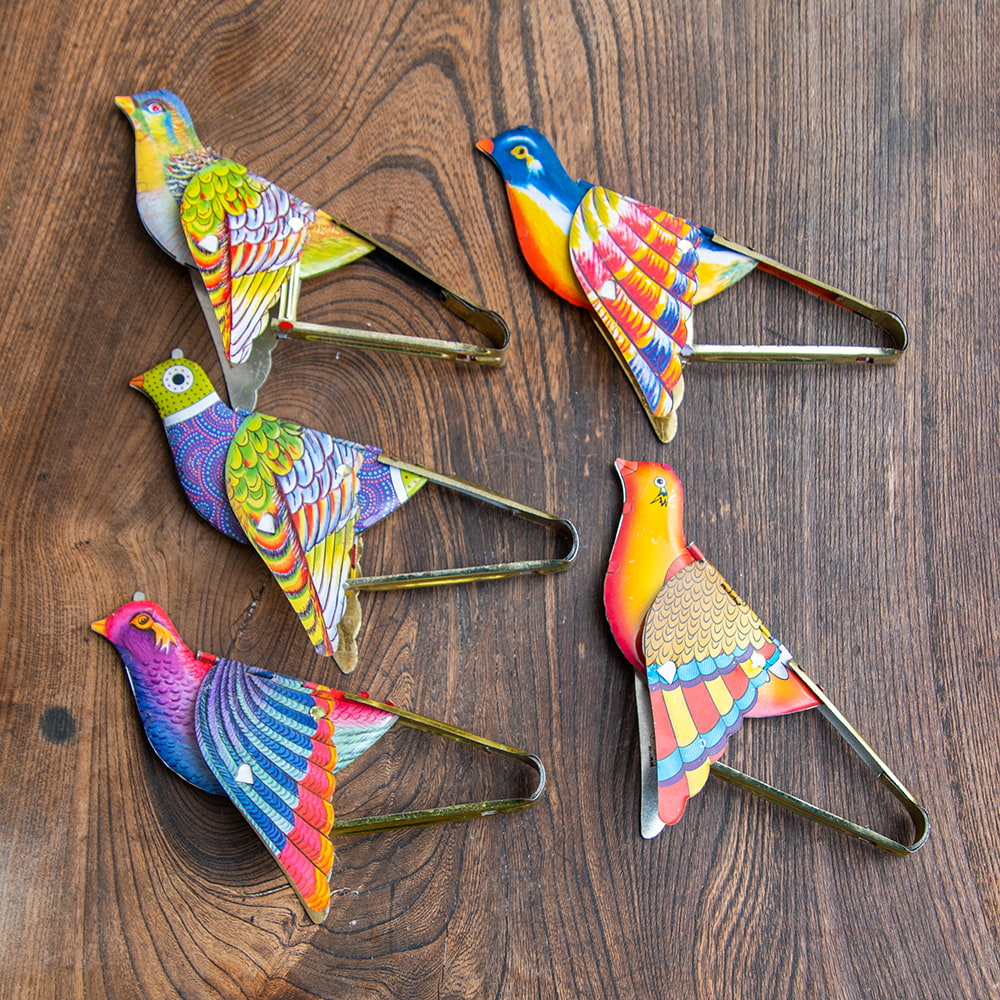 鳥好き仲間にプレゼントするために5個入りを買いました。5個のうち3個が同じ柄の鳥でした。パタパタさせて飼ってる鳥たちに見せてやったら不思議そうにしながらも興味津々でした。軽い力で動かせてとても可愛いです。小さなお子さんに持たせる時は金属部分で怪我をしないよう見守ってたほうがいいなと思いました。とにかくかわいい!!子どもたちで奪い合いになりました。パタパタと羽ばたく様子や音も愛らしいです。飾ったり遊んだりしています。色々なデザインがあるので集めたくなっちゃいました。