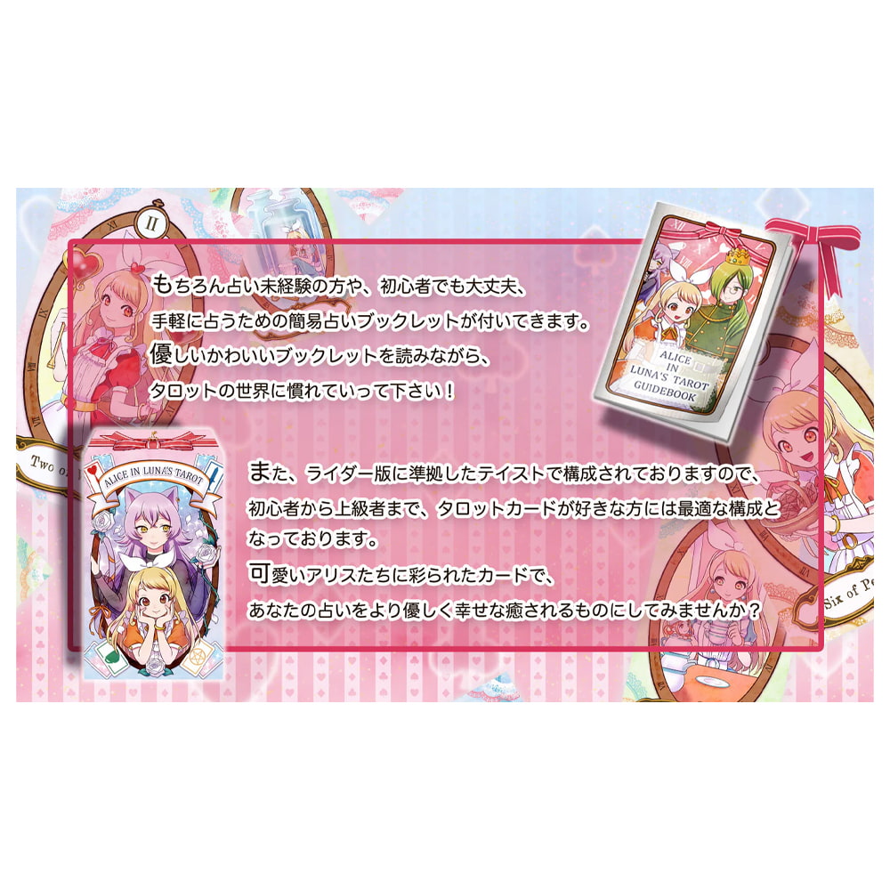 可愛いアリスの世界観で、タロットのイメージが変わる!初心者でも気軽に楽しく始められるセット。タロットは難しい…そんな初心者にも最適な優しいタロットガイドブック付き。入門に最適。