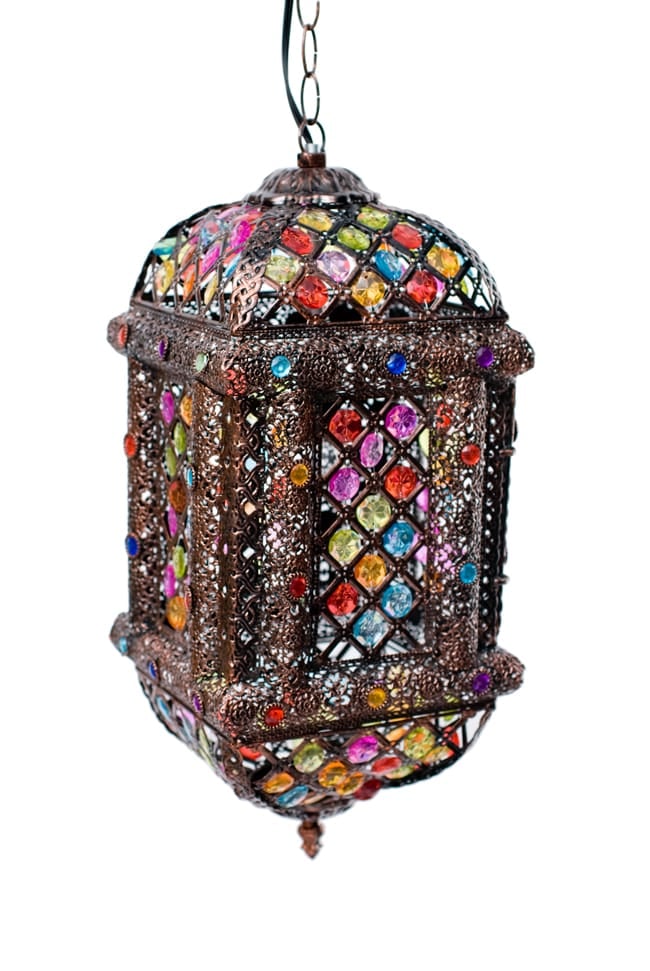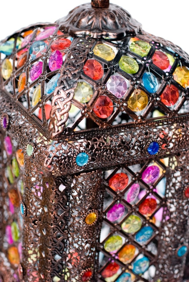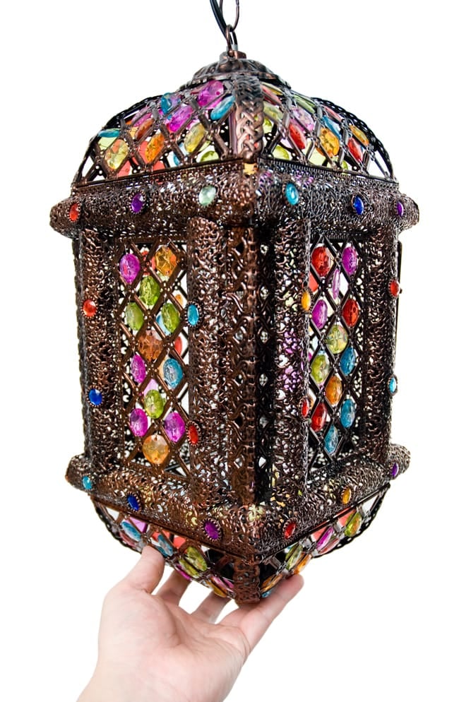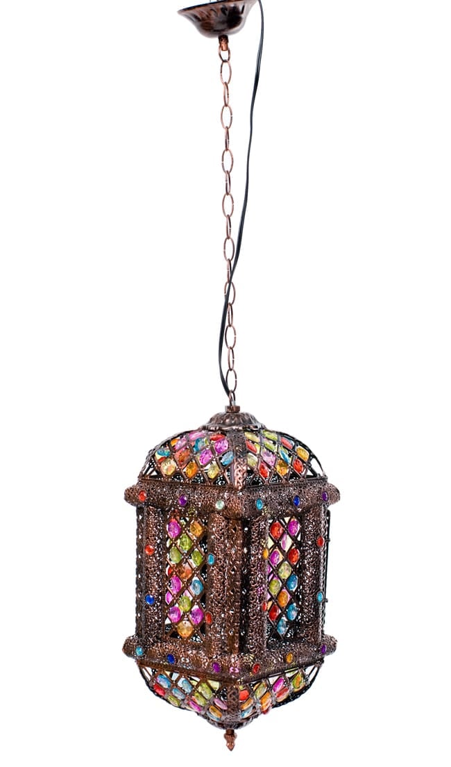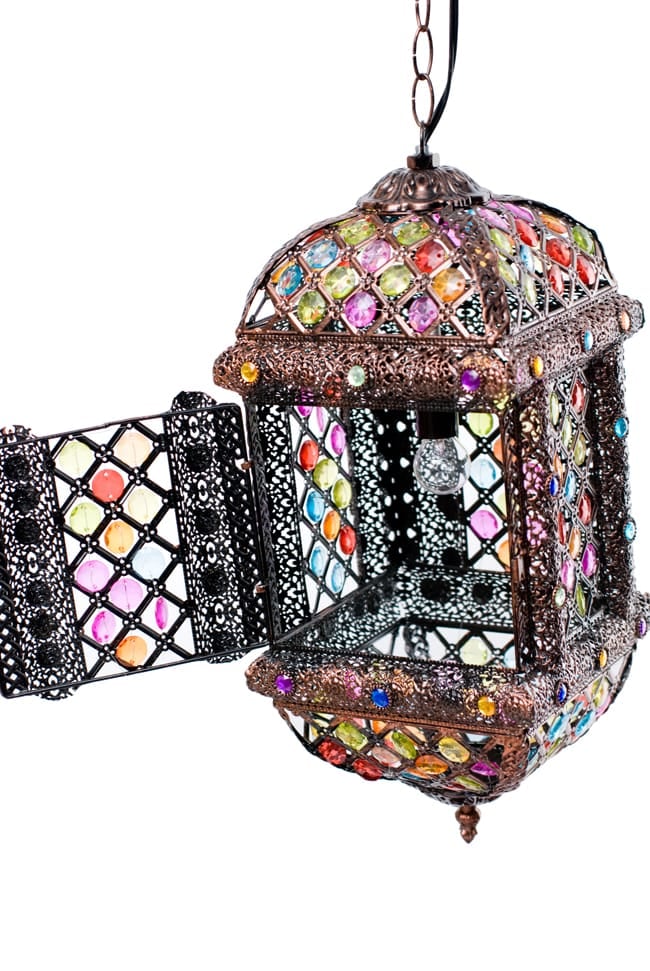 色とりどりに装飾されたアラビアンランプ。こちらは吊り下げて使うランプです。