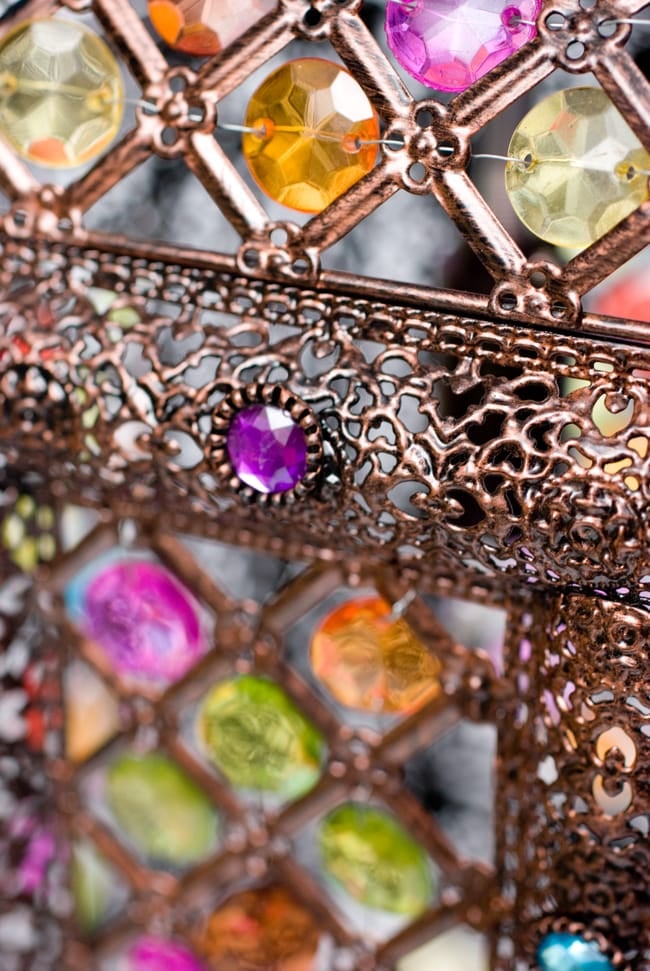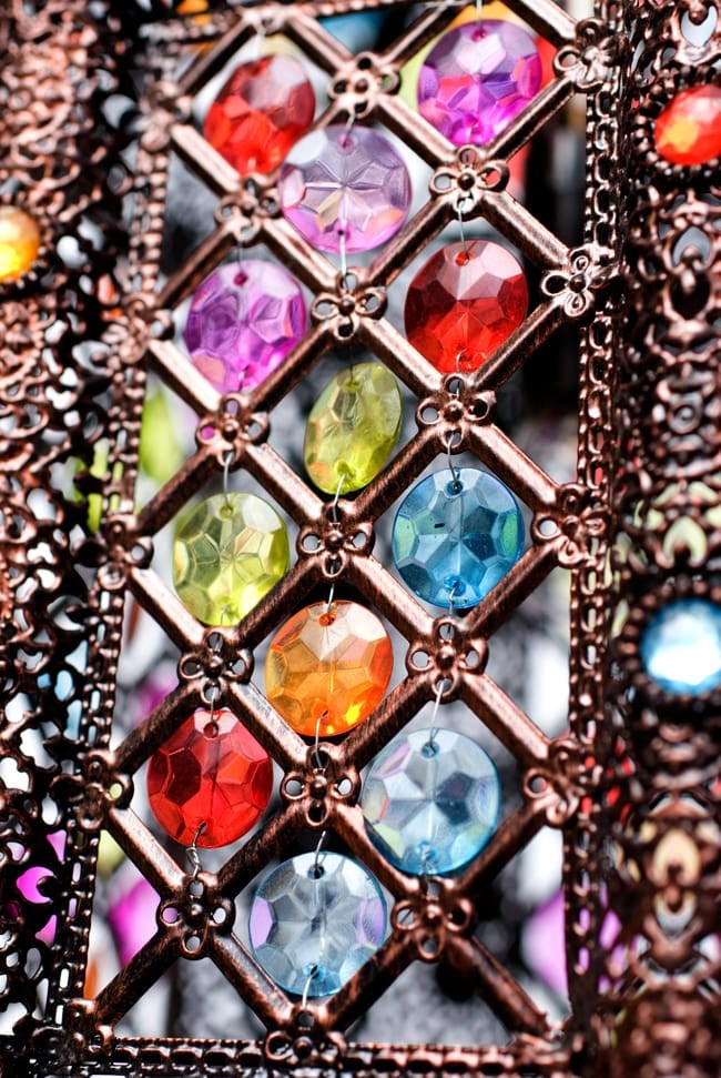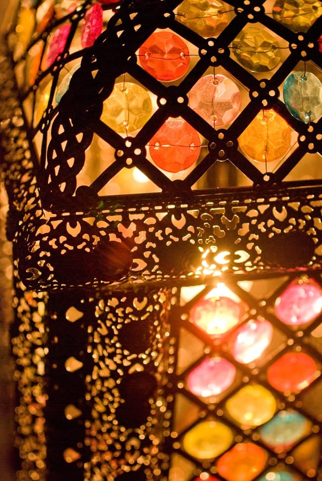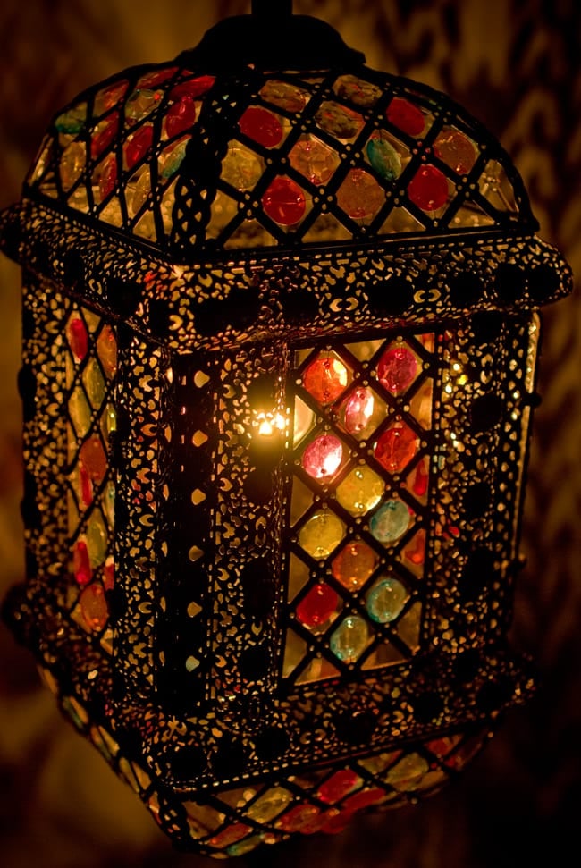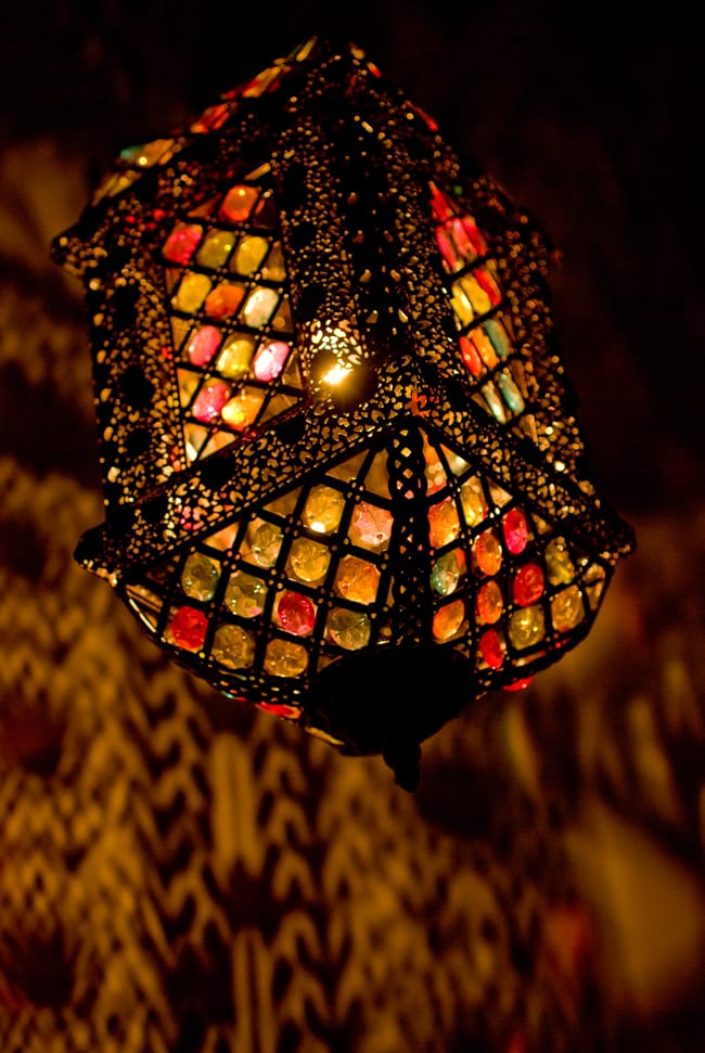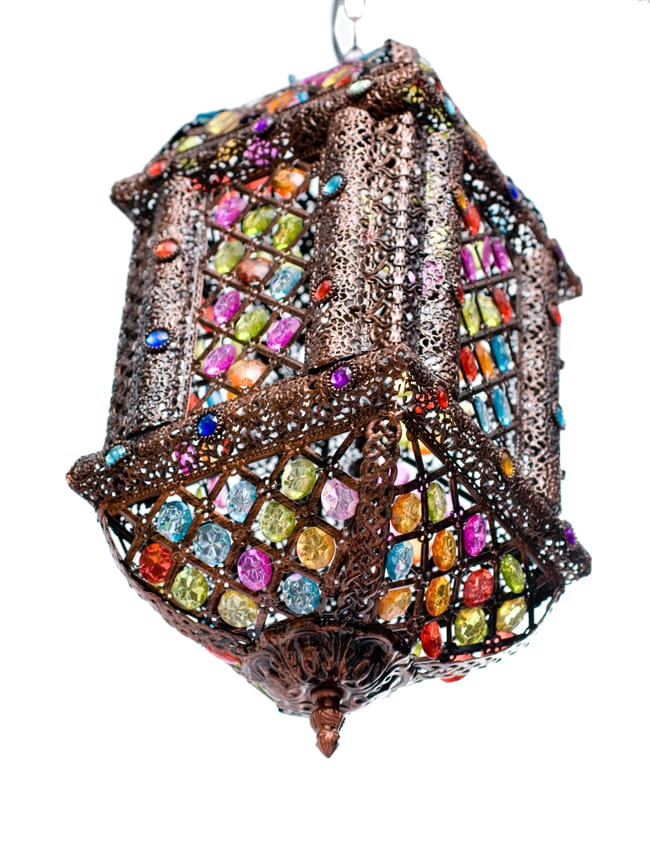 色とりどりに装飾されたアラビアンランプ。こちらは吊り下げて使うランプです。