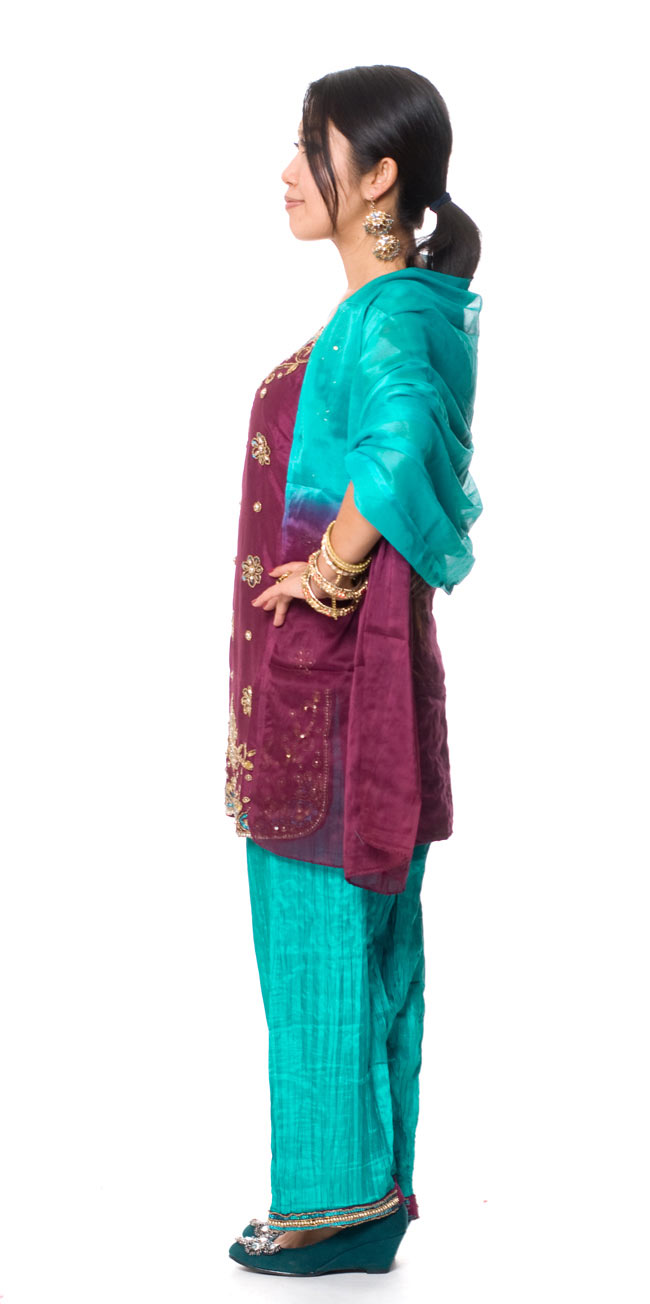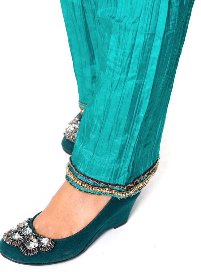 パンツのシルエットはいくつか種類があり、次のように分かれています。ゆったりとした「サルワール」、膝辺りから足首までがタイトになっている「チューリーダール、裾がラッパ状に広がった「ベルボトム」。合わせる靴は自由ですが、ある程度ヒールのある靴で合わせてみるとカッコ良いと思います。また、サルワールとチューリーダールはウエストが1m以上あるのが一般的と言われており、付属の紐を通し、きゅっと縛って履きこなして下さい。★こちらのデザインは、腕まわりが小さいデザインとなっております。肩幅のある方などは着脱しにくい可能性もございます。ご注意下さいませ。