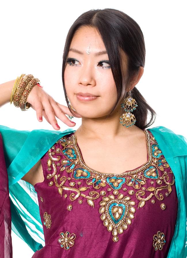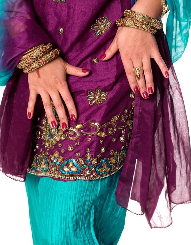 またの名を「サルワール・カミーズ」とも呼ばれる、南アジアの民族衣装です。シャツを意味する「カミーズ」、ズボンを意味する「サルワール」、「ドゥパッタ」と呼ばれるショールの3点セットで着用します。3点セットなので、お色味もコーディネートされていてとても統一感があります。インドでは、サリーに比べると若年層が愛用しているというイメージでしょうか。デザインもパンツなので動きやすくスタイリッシュなデザインとなっています。■スパンコールやビーズ、刺繍で華やか