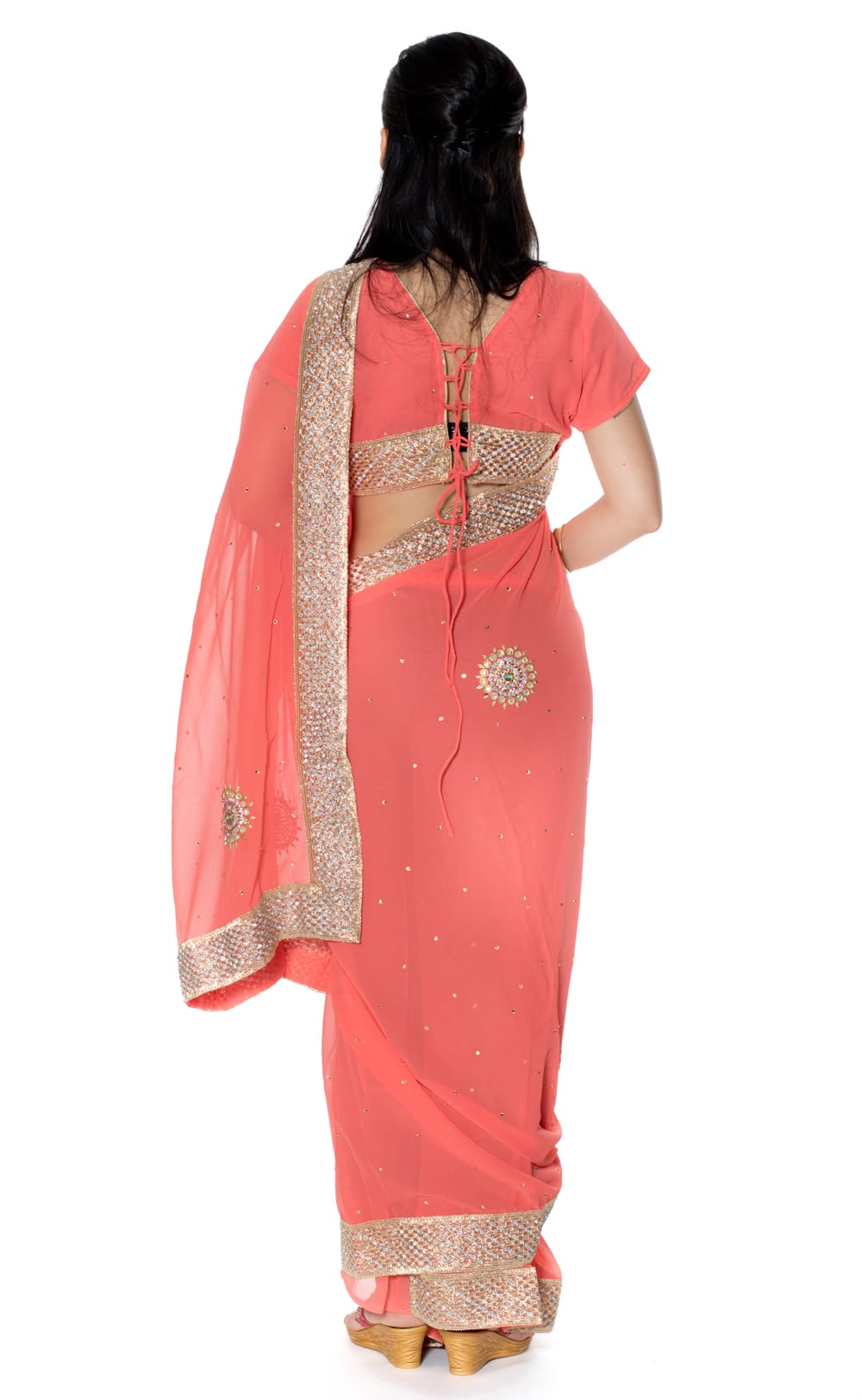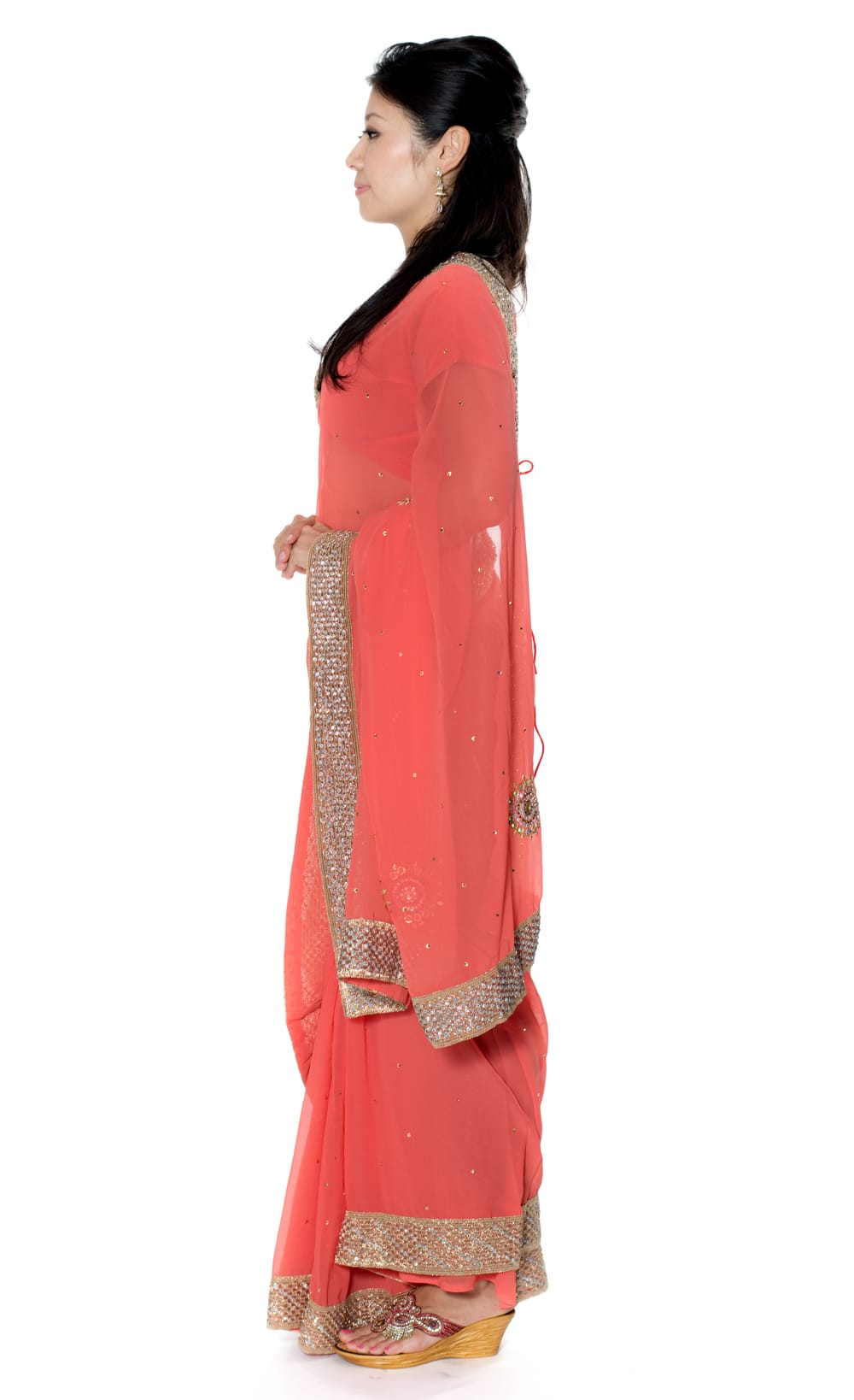 サリーはただの布ですので、完全にフリーサイズ。巻きの長さの調整をして頂ければ、安心してお楽しみ頂けます。金糸とビーズ刺繍のジョーゼットインドサリー【チョリ付き】 - サーモンピンクの類似商品