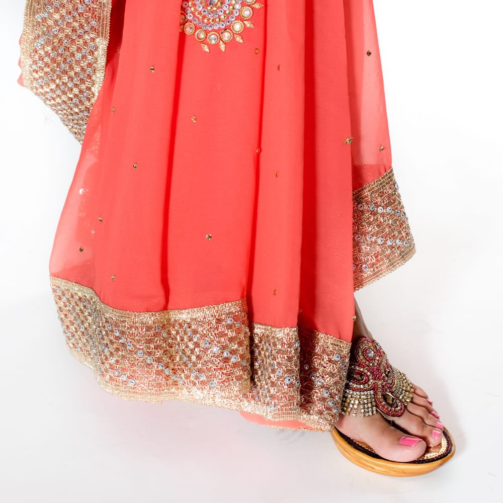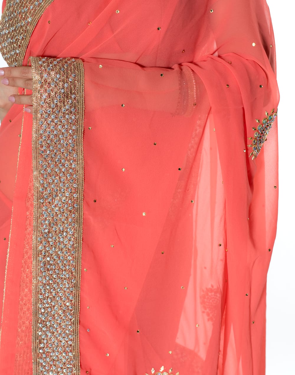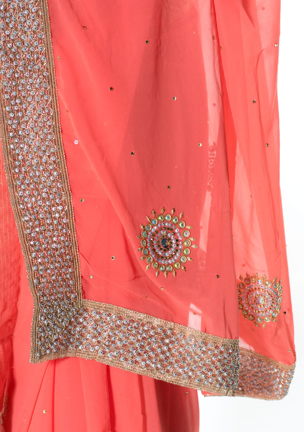 金糸とビーズ刺繍のジョーゼットインドサリー【チョリ付き】 - サーモンピンク