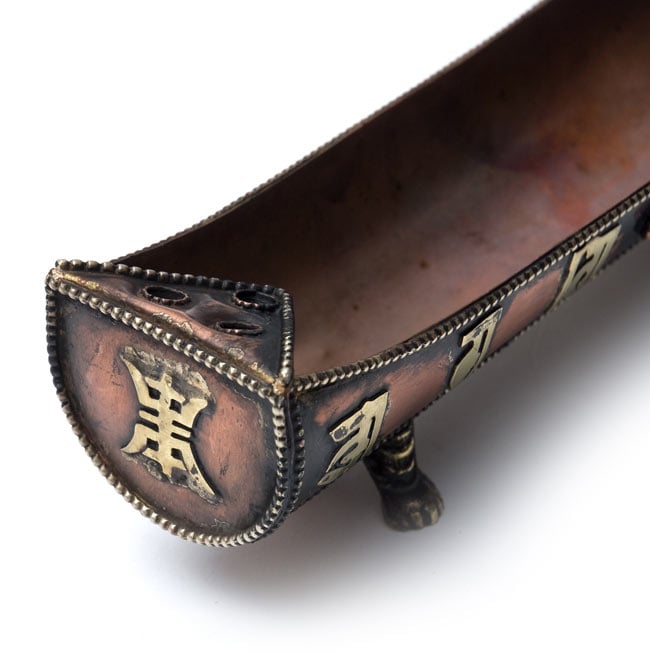 チベットのお香と一緒に、このお香立てを購入しました。お香立ては何種類かありましたが、これを選んで正解でした。正面の内側には小さな仏陀像があり、足4本は動物の足の形です。サイドの梵字は貼り付けられているようで、凹凸があります。お香を立てるための穴の直径は大きく、チベットお香にピッタリです。大満足。