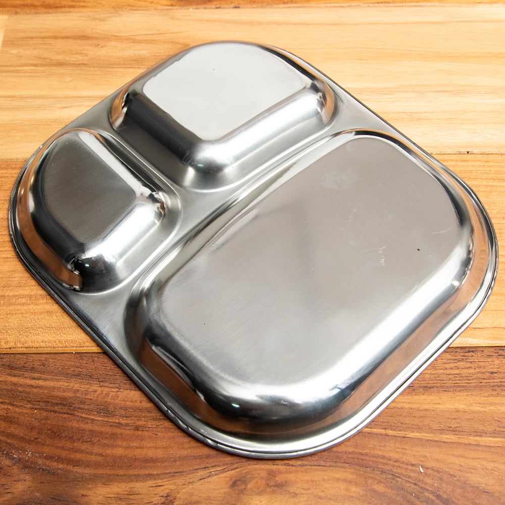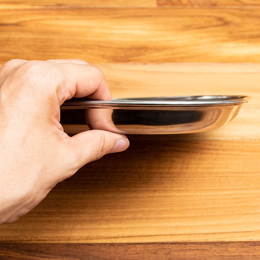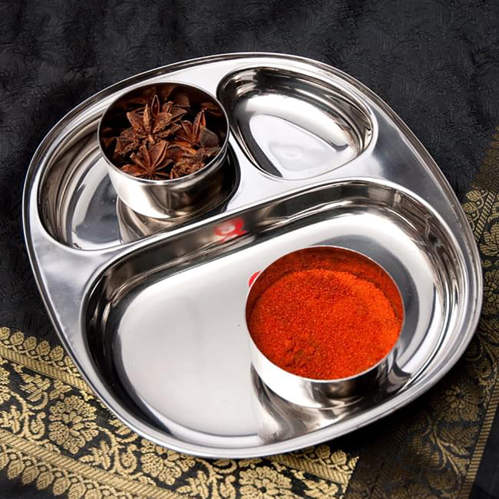 インドで作られ、使われているステンレス製のランチプレートです。小学校の頃、給食でこんな食器を使った方も多いのではないでしょうか? なんだか懐かしい感じですが、インドではまだまだ現役です。深さもあるのでインド風にカレーを入れてもいいですし、普通のランチプレートとしても使いやすいです。同じお皿であれば重ねて収納できますので、食器棚のジャマにもなりません。
