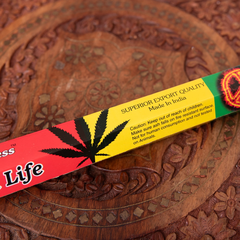 サンダルウッドパウダーやハーブ、自然のエッセンシャルオイルなどを配合して作られたHigh Life香です!まず目につくのはパッケージの赤、緑、金色、黒を組み合わせたラスタカラー。さらにマリファナのシルエットがあり、これでもかと反戦運動のシンボルであるピースマークまでついています。派手なパッケージとは裏腹に、香りは落ち着いて心静まる良い香りです。ハッピーなあなたへオススメの一品!